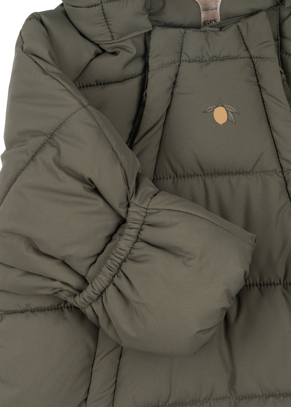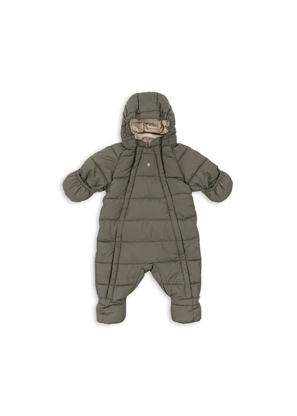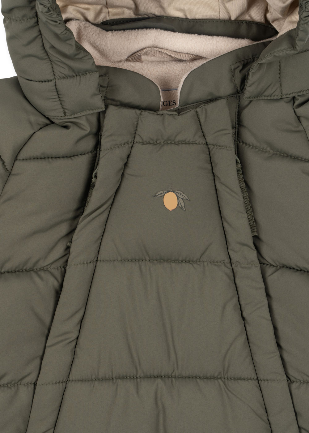Varm vinterdräkt med avtagbar huva och mjukt fleecefoder längs kroppen och kragen. Praktiska dragkedjor fram som kan öppnas helt för enkel påklädning.