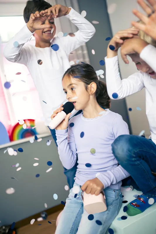 Från +4 år. Här är ett fantastiskt trådlöst karaoke set för barn som består av en Bluetooth högtalare och en trådlös mikrofon i rosa. Detta set är det ultimata verktyget för att skapa en rolig och underhållande upplevelse för både barn och vuxna där ni kan sjunga med i era favoritlåtar, uttrycka er musikaliskt och ha riktigt kul - eller bara göra er hörda. Högtalaren är inte bara snygg utan är dessutom utrustad med ett praktiskt, löstagbart handtag som gör den enkel att bära med sig, samt en minneskortsplats för ett TF/Micro SD kort på upp till 32 GB (ingår ej) som gör det möjligt att spela upp musik och annat även utan en Bluetooth enhet. Med ett imponerande frekvensomfång på mellan 20 och 20 000 Hz levererar denna Bluetooth högtalare en bra ljudkvalitet i ett kompakt format, och om mikrofonen stängs av kan den helt enkelt avvändas som en trådlös högtalare. Både mikrofonen och högtalaren är utrustade med praktiska knappar för att enkelt styra musiken, med antingen snabba eller långa tryck beroende på vilken inställning du vill göra. Mikrofonen har till och med en cool eko-effekt som lägger till det där lilla extra till upplevelsen och som aktiveras och stängs av med ett långt tryck på mikrofonens nedre knapp. Att ladda ner dina favoritlåtar från streamingtjänster som till exempel Spotify är enkelt och flera tjänster tillhandahåller även låttexten, så det är bara att koppla din smartphone eller annan enhet till Bluetooth högtalaren och sätta igång festen. Detta set är utrustat med Bluetooth v5.0 som ger en stabil anslutning med en räckvidd mellan enheterna på ca 10 meter, upp till 15 meter beroende på omgivningen. Både högtalaren och mikrofonen har laddbara batterier som enkelt laddas med den medföljande USB-C sladden. Paketet innehåller: 1 Bluetooth högtalare med avtagbart handtag, 1 mikrofon med avtagbart skumlock, 1 USB till USB-C laddningskabel, 1 förvaringspåse med dragsko, samt en användarmanual på 8 språk (DE, DK ENG, ES, FR, NL, NO och SE).