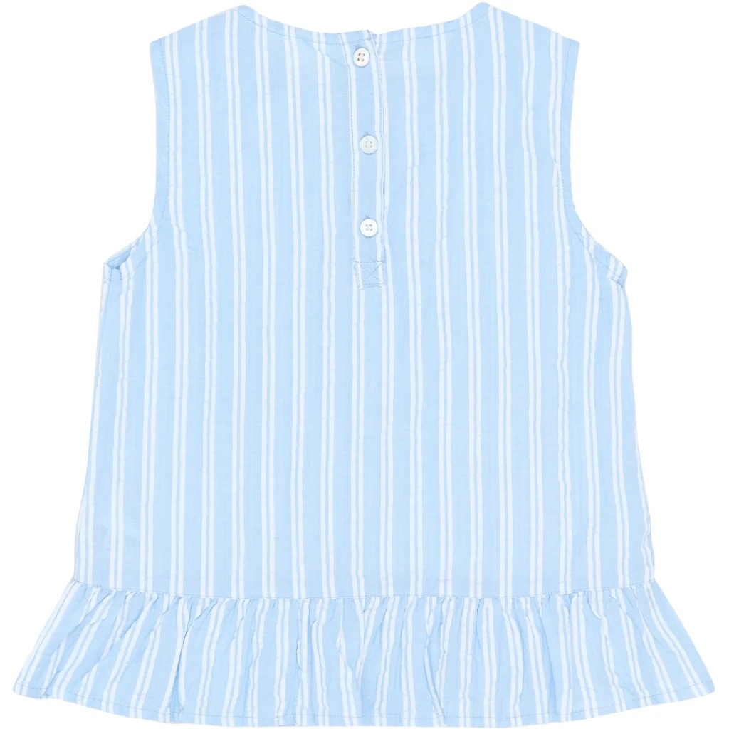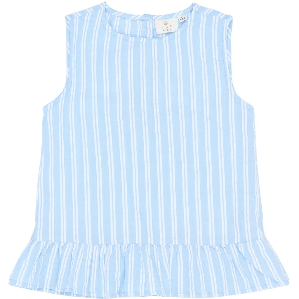 En söt och somrig ärmlös topp för tjejer med en fräsch randig look. Toppen har en rund halsringning och en lätt A-form som faller vackert och ger god rörelsefrihet. Nedtill avslutas den med en fin volang, vilket skapar en charmig och lekfull look. Den är tillverkad av 100 % bomull, som känns mjuk mot huden och är bekväm att bära hela dagen. Perfekt för allt från skolan och vardagsliv till födelsedagar och semestrar, och lätt att styla med shorts, jeans eller kjol.