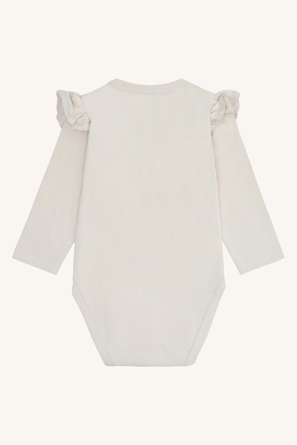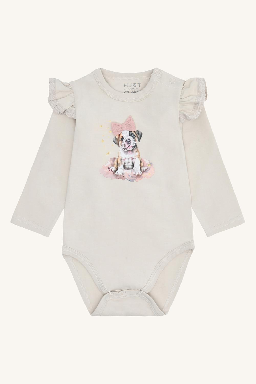 Långärmad body tillverkad av stretchig bomull. Modellen har ett hundmotiv framtill och knappknäppning på höger axel och mellan benen.