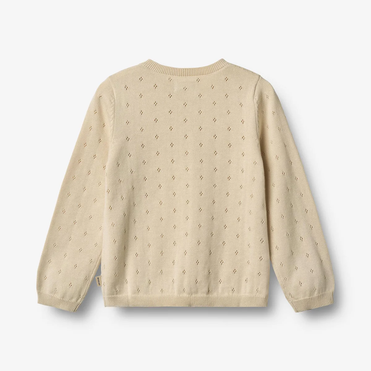 Långärmad stickad kofta tillverkad av mjuk ekologisk bomull och har ett fint spetsmönster och en A-formad design för en snygg men bekväm passform. Med ribbade detaljer vid halsringning, ärmslut och fåll är den ett perfekt plagg för alla outfits.