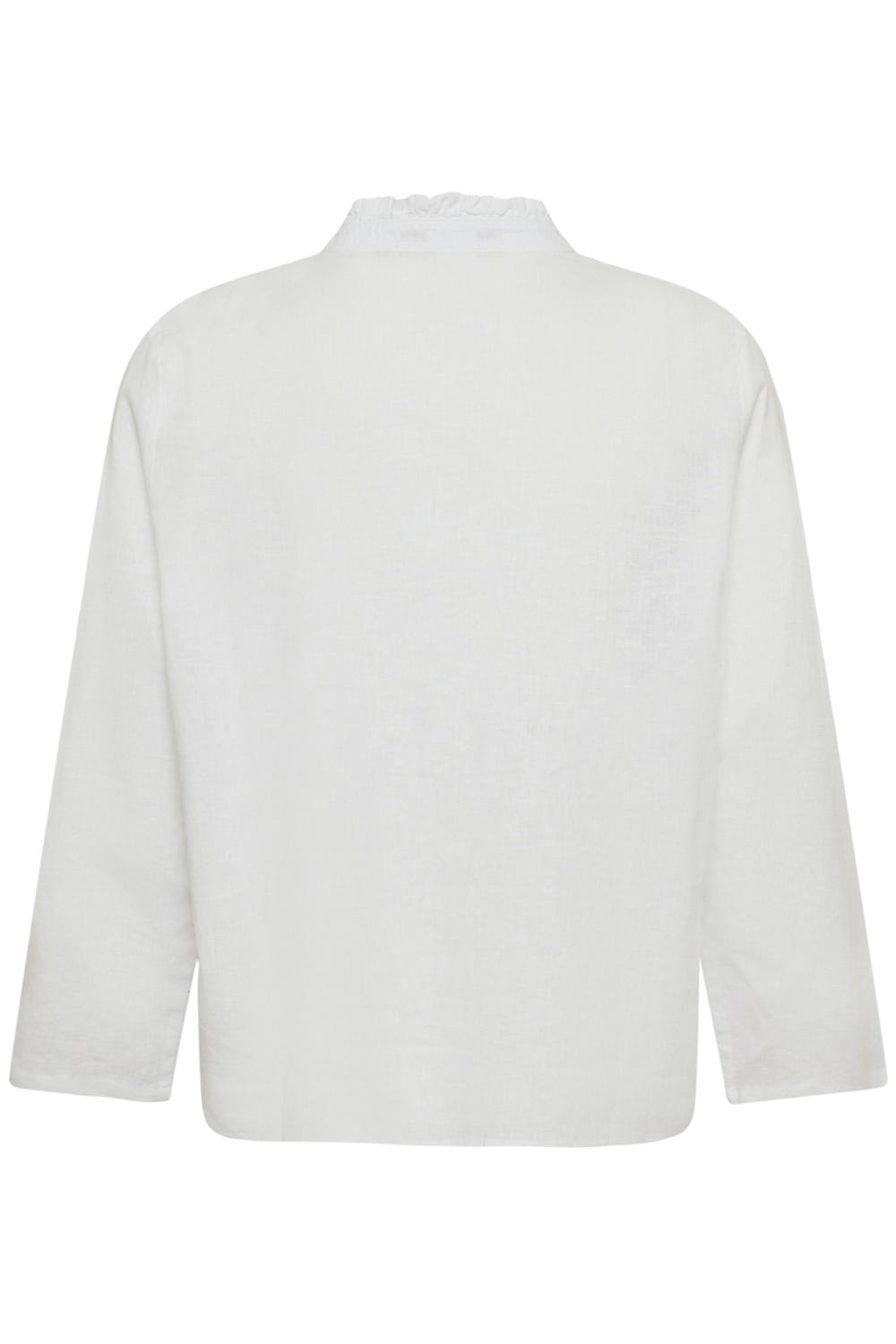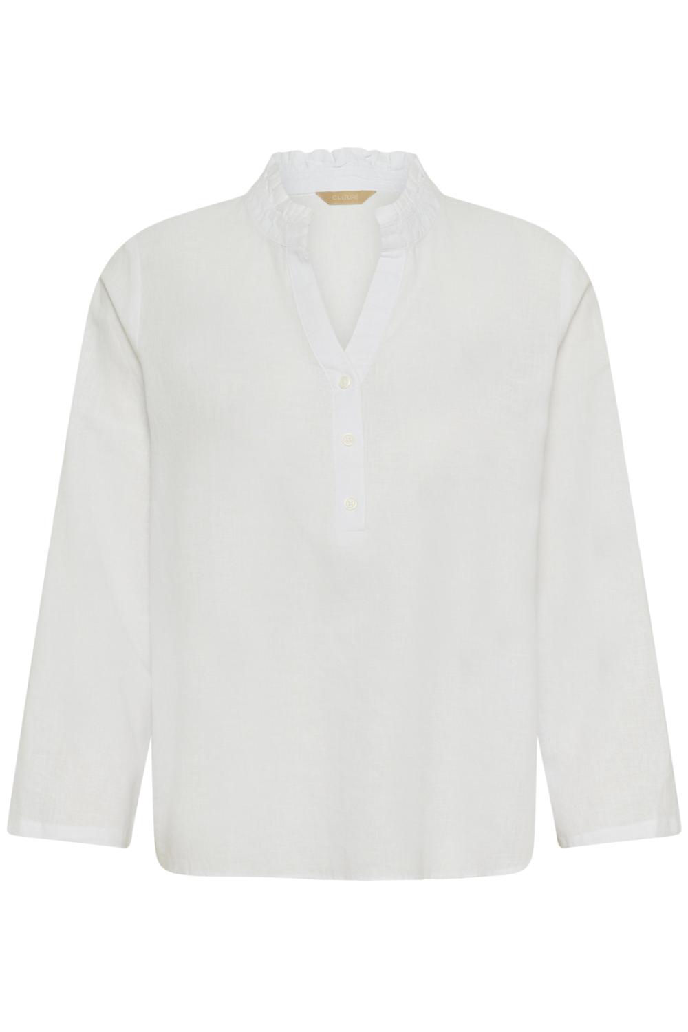 Blus med avslappnad passform, rynkad ståkrage och V-ringning med knappslå. Bekväm 3/4-ärm, perfekt för både vardag och arbete.