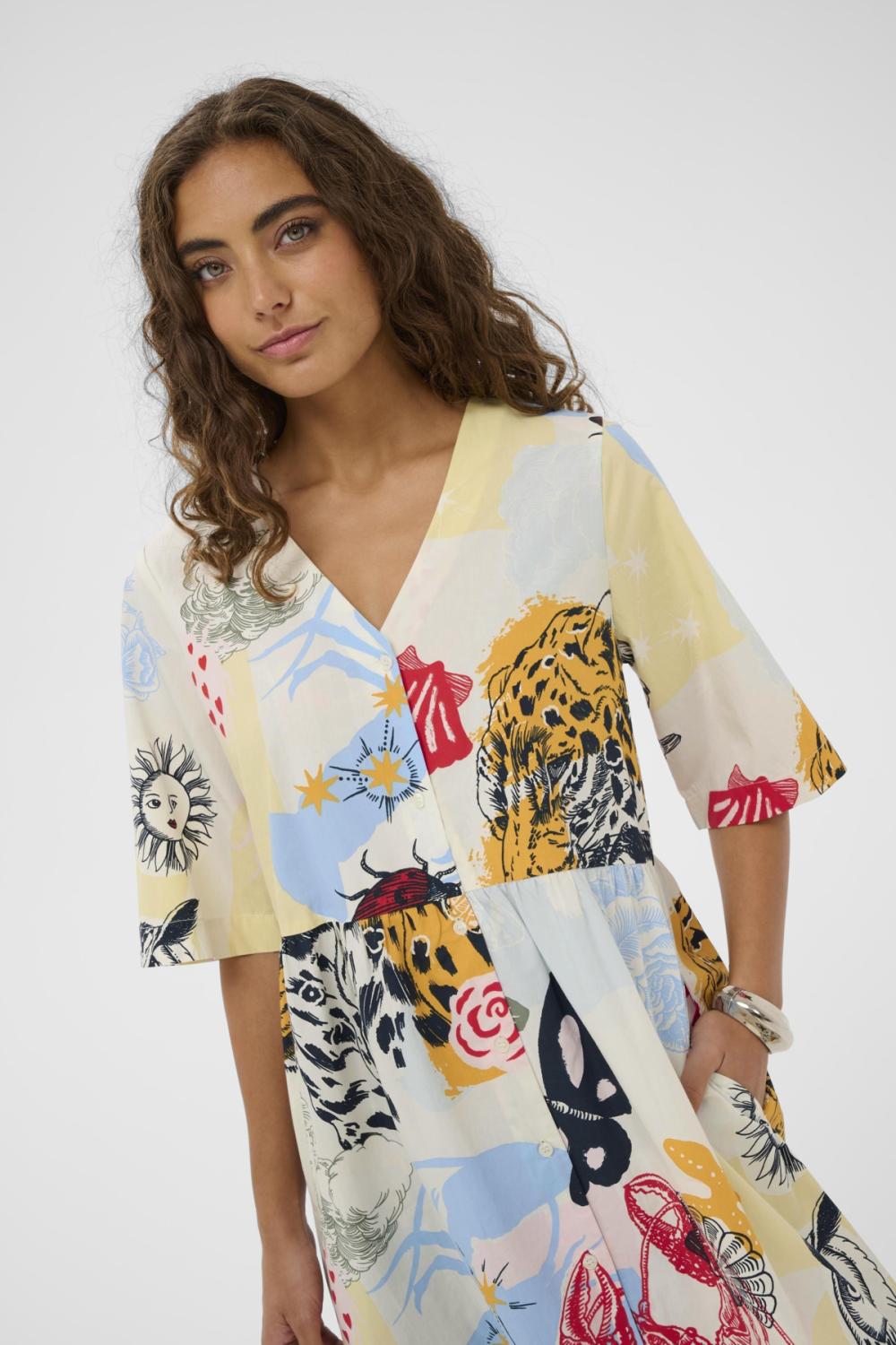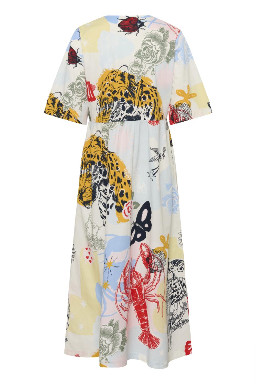 Maxiklänning med V-ringning, vida korta ärmar och diskret rynkad midja. Stick ut med hela plaggmotivet. Rak, luftig silhuett.