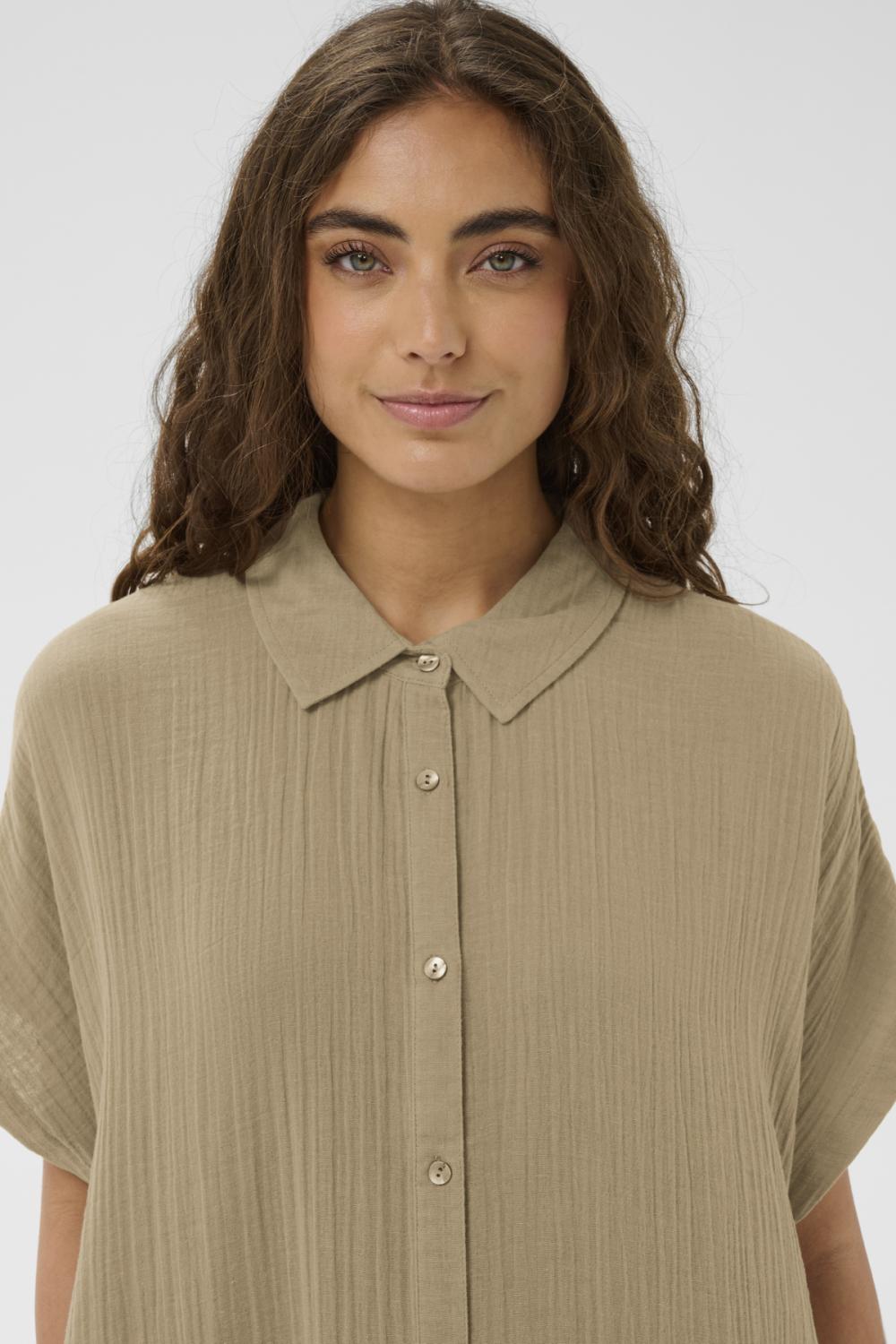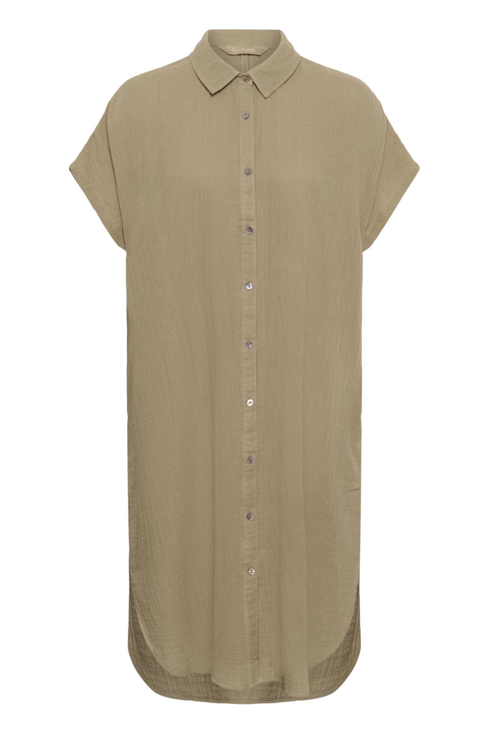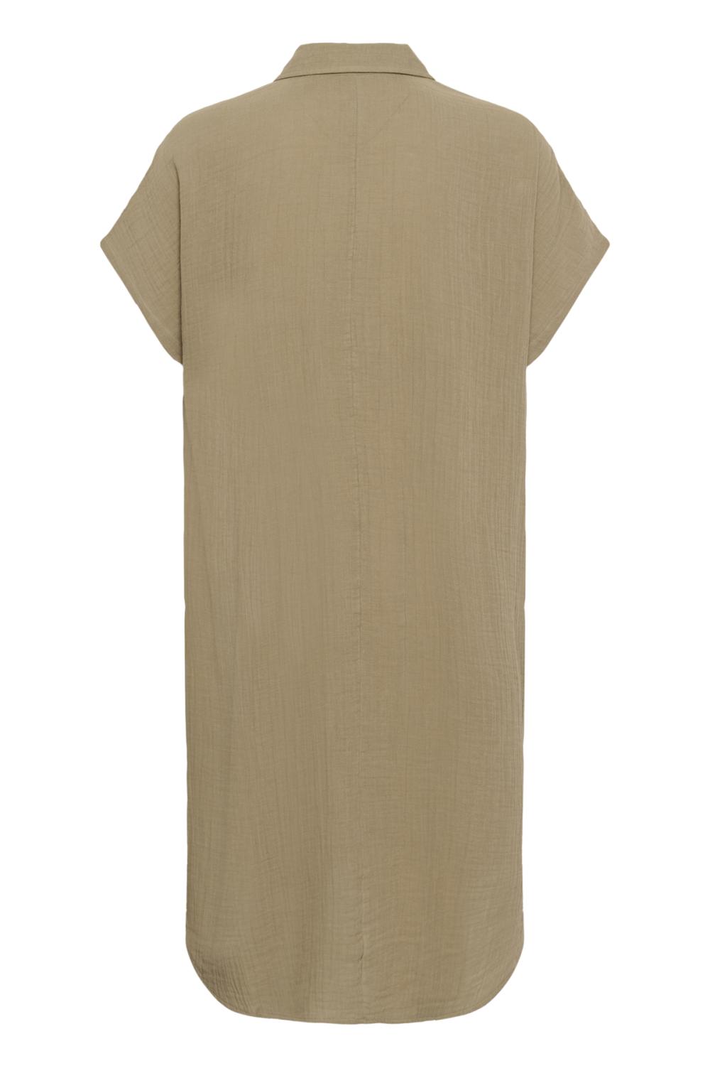 Skjortklänning i avslappnad passform med krage, hel knappslå, korta, vida ärmar och texturerad yta. Knälång, enkel och stilsäker siluett.