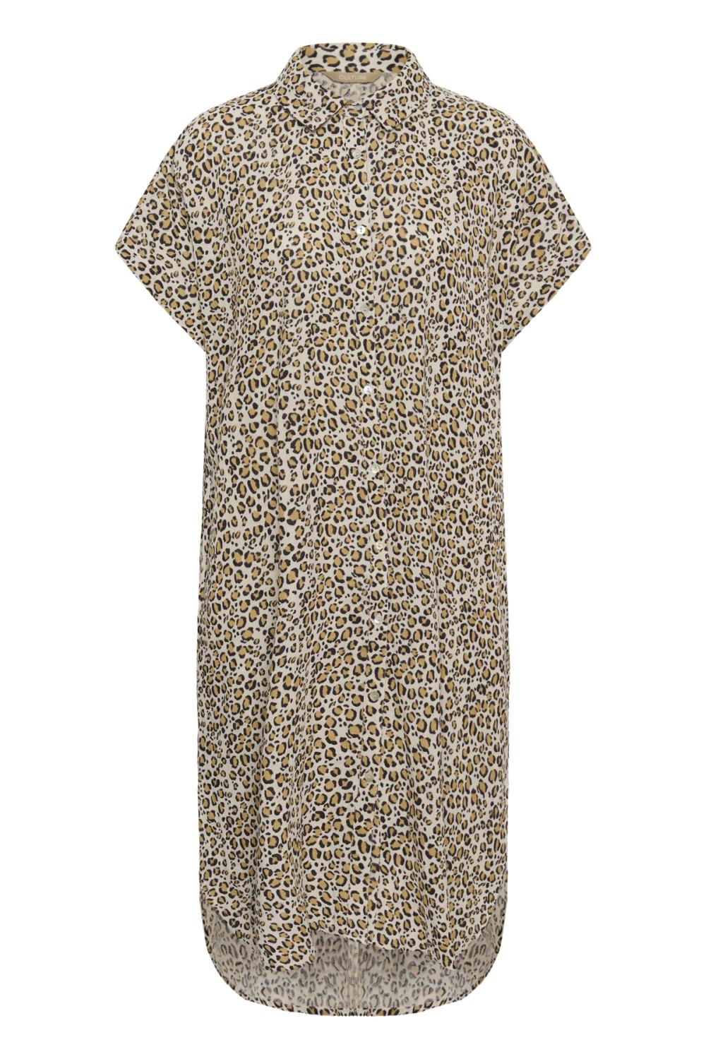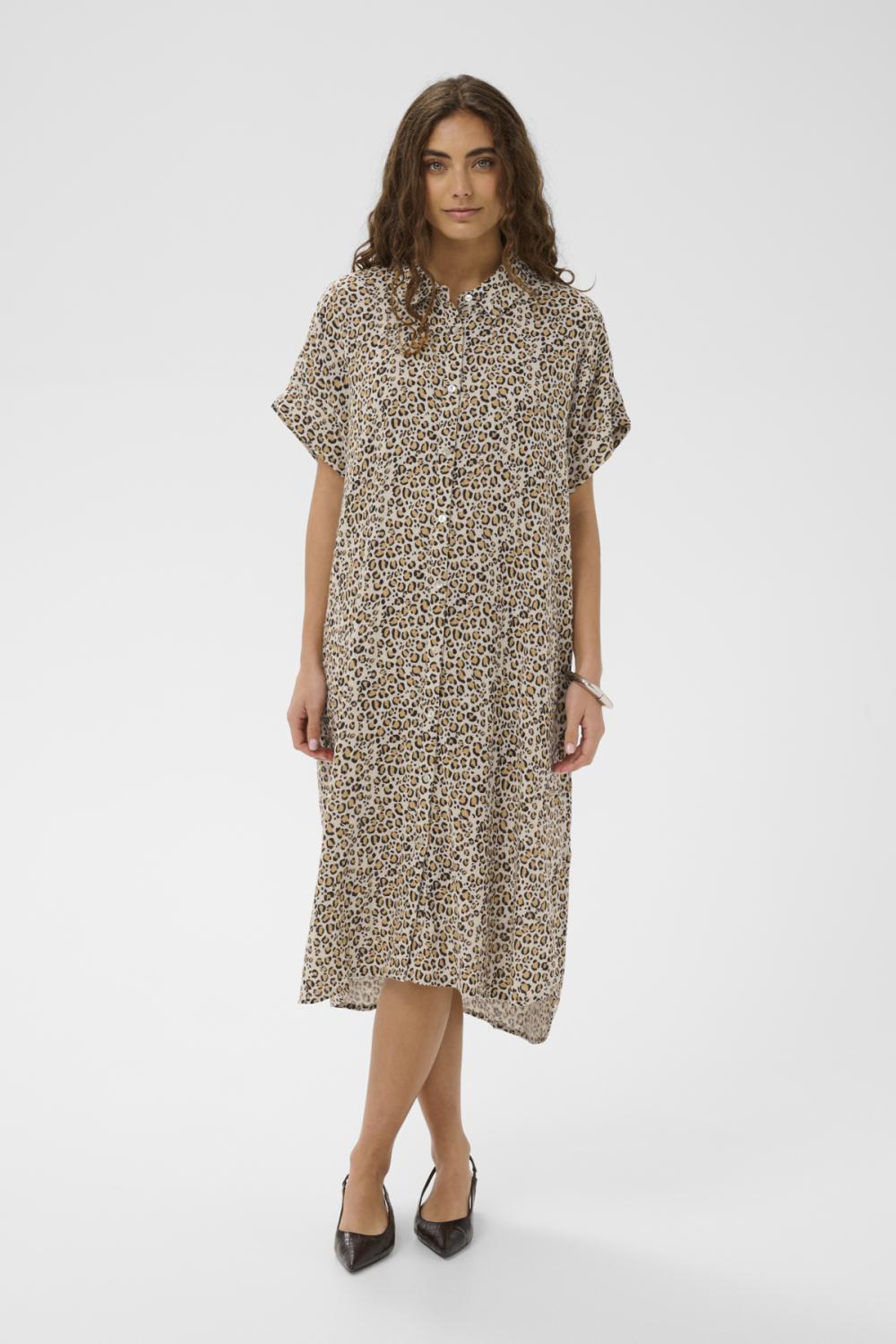 Skjortklänning i avslappnad passform med krage, hel knappslå, korta, vida ärmar och texturerad yta. Knälång, enkel och stilsäker siluett.