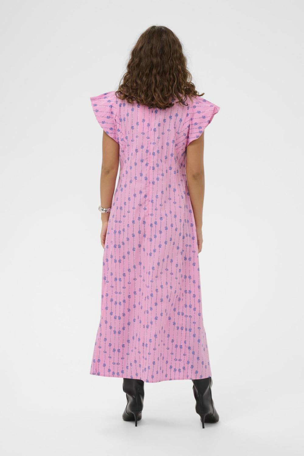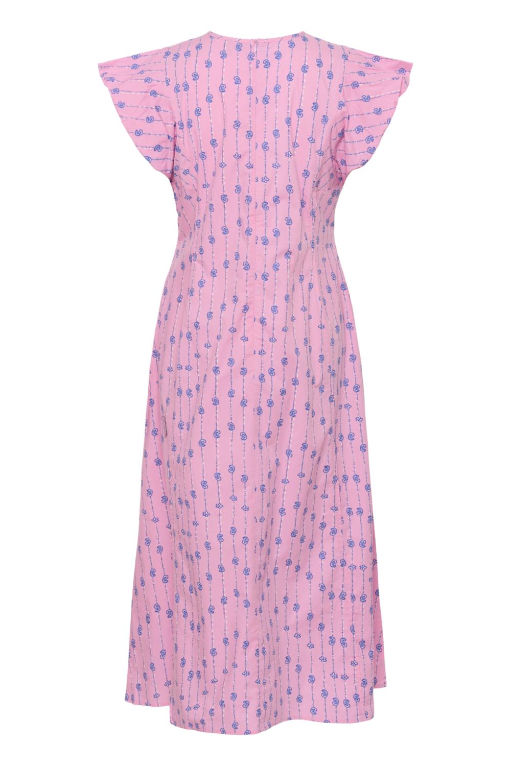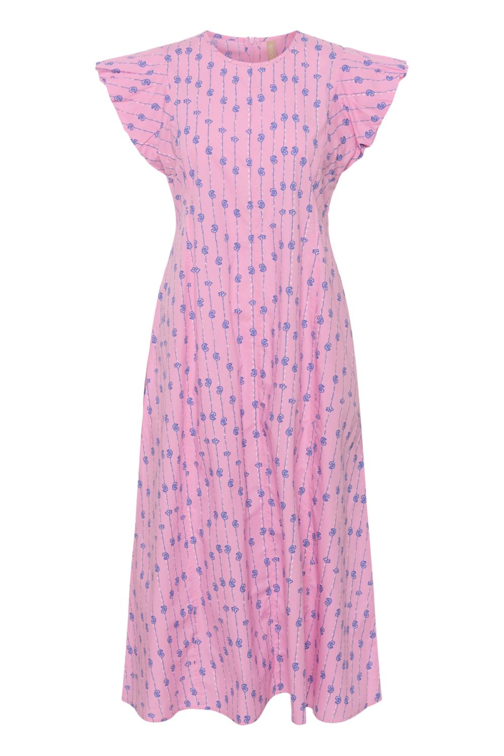 Midiklänning med rynkad capärm, rak siluett och mjuk strukturerad yta. Rund halsringning ger ett enkelt, fräscht uttryck.