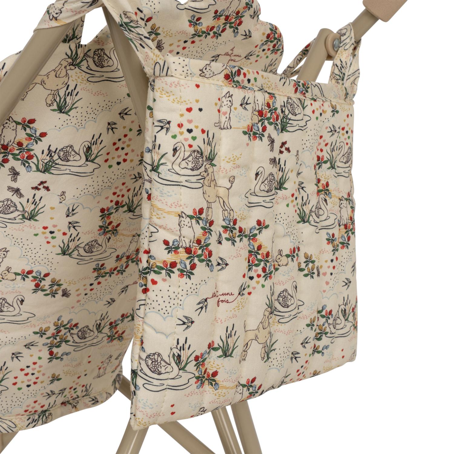 Dockvagn designad med sele, vagnsväska och dubbla hjul på alla fyra ben för extra stabilitet. Har avtagbart tyg. Kommer färdigmonterad. Lätt att vika ihop och förvara. Ramen är gjord av järn med mjuka och svampiga handtag.