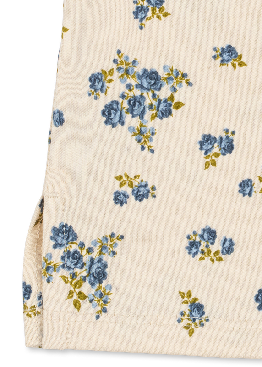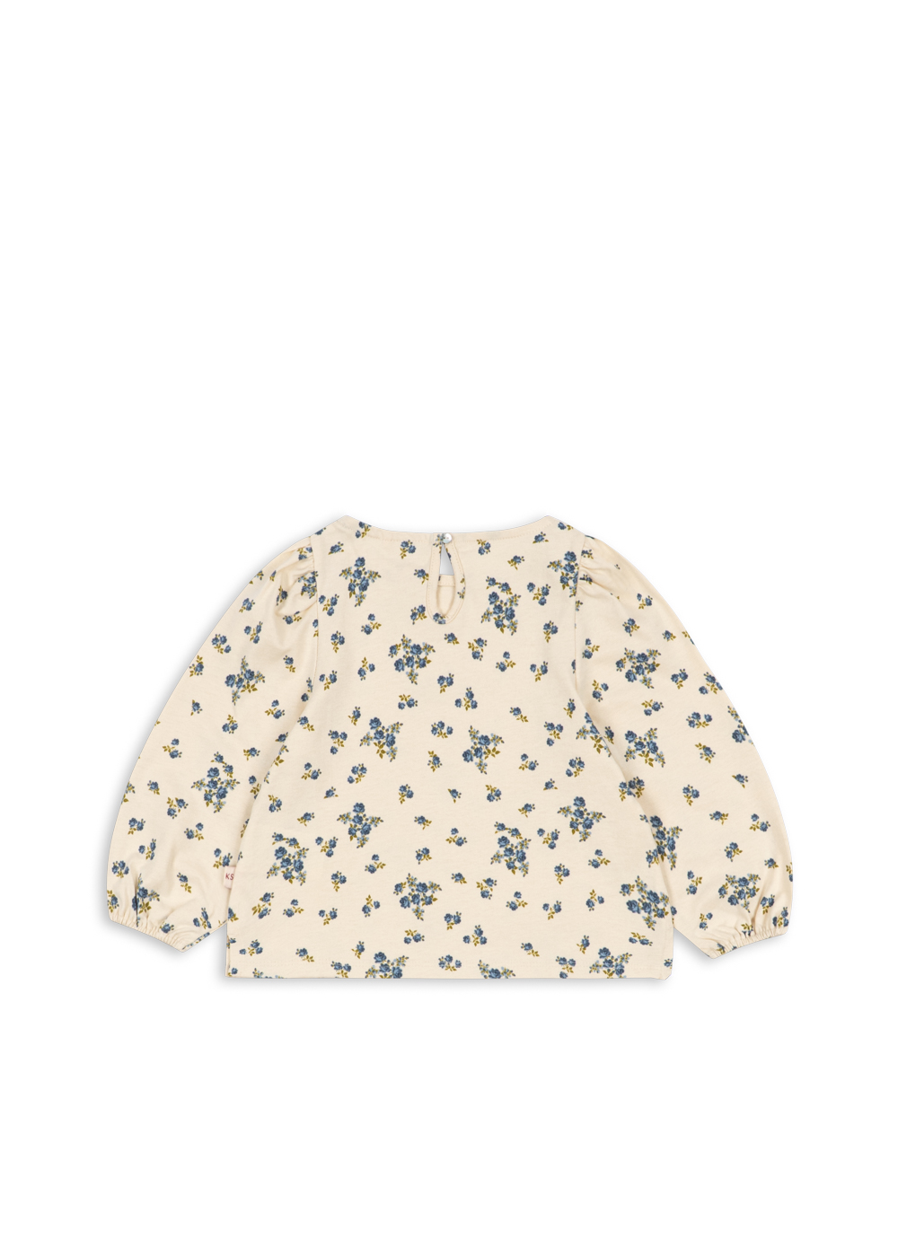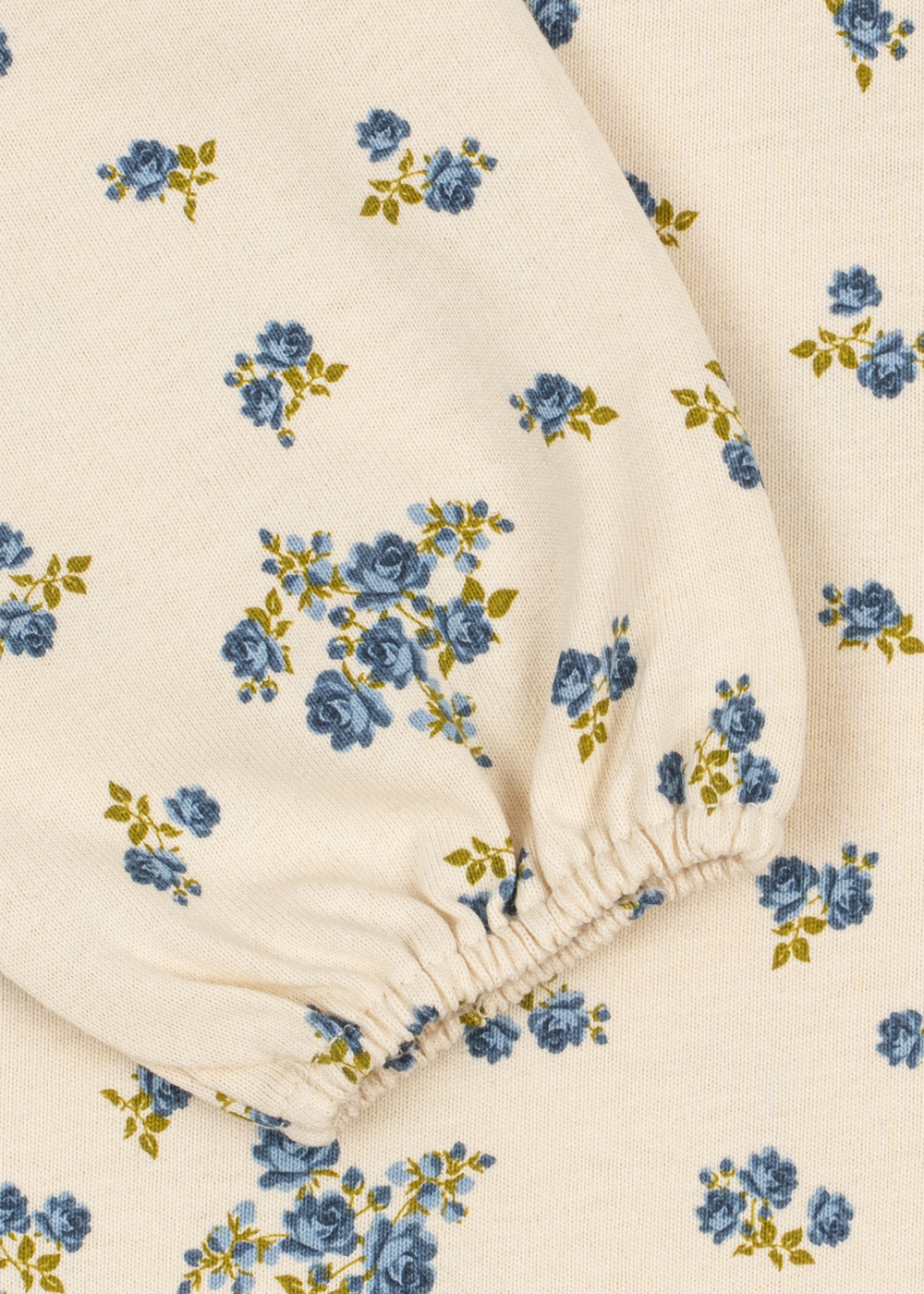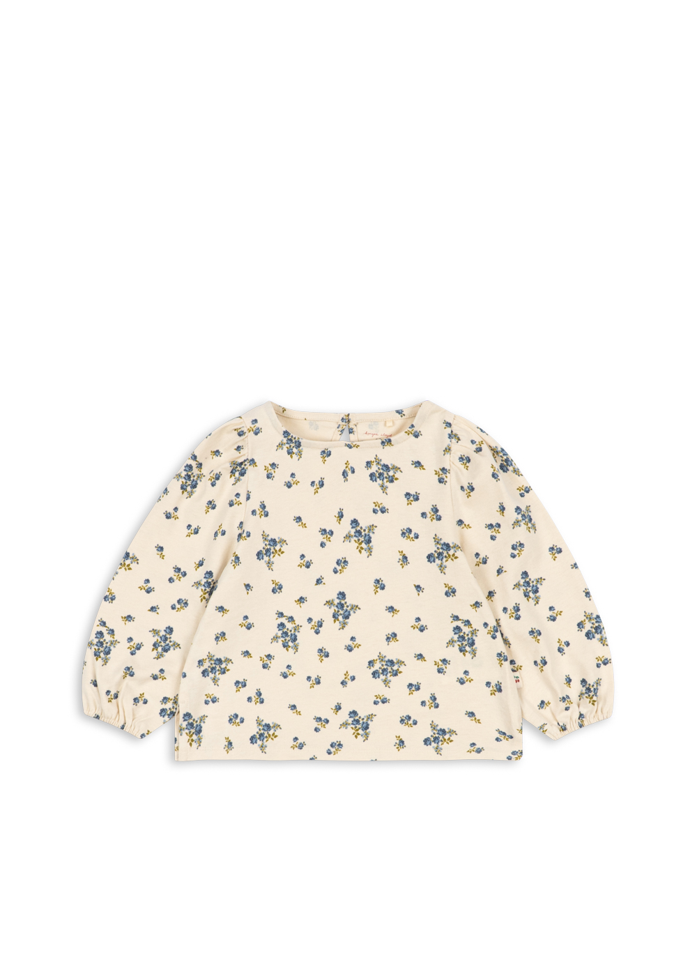 Blus från Konges Sløjd i 100 % ekologisk bomull med blommönster i blå och gröna nyanser på en cremefärgad botten.