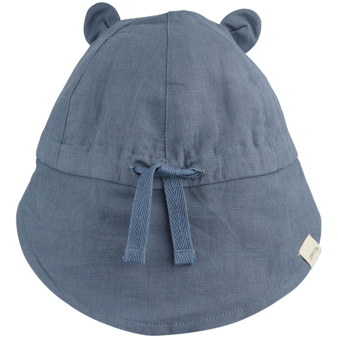 Gullig solhatt med mindre skärm fram och större bak som skyddar nacken och det lilla ansiktet mot solens strålar. Dekorativa öron upptill, snören för reglerbart omfång och bästa passform baktill.