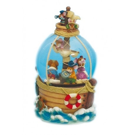Inne i glob finns det fyra möss, tre försöker lista ut var de har  hamnat och den fjärde sitter på stora seglet och försöker binda fast  det. Ovanpå sitter två små möss, en av dem har en kikare och tittar in i  horisonten. Utsidan av speldosan är dekorerad som en flotte i havet med  vågor och allt. Titta på alla små detaljer!  Mycket fin och färgglad  speldosa, perfekt doppresent!