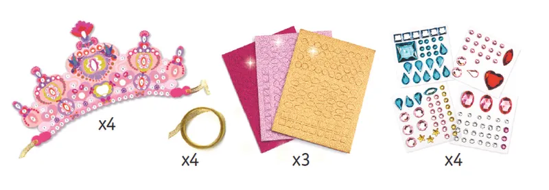 Kul pysselset för den lilla prinsessan. Att dekorera var sin krona är en perfekt sysselsättning på t ex ett barnkalas. I förpackningen ingår material till fyra kronor. Kronorna dekoreras med stickers, dekorationsstenar som glittrar och skiner. Detta är en FSC®️ MIX certifierad produkt.