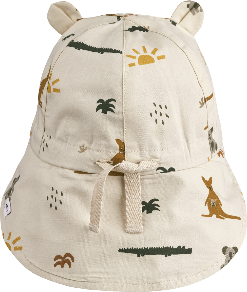 Smart Liewood solhatt i beige, med tryck av djur och växter i gröna, bruna, gula och grå nyanser. Längst upp finns två söta öron.