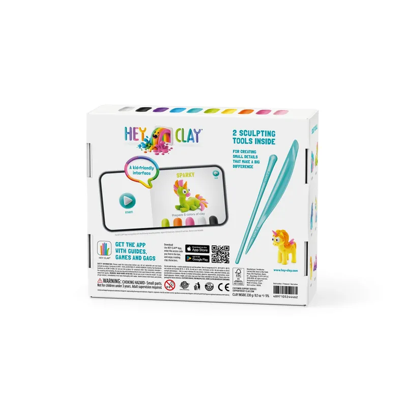 Den tillhörande gratis-appen är barnvänlig och har interaktiva videoguider som ger enkla steg-för-steg instruktioner (med tal på engelska) för hur man skulpterar dessa karaktärer och många fler. För att låsa upp beskrivningarna i appen för setets alla karaktärer använder ni den kod som står på informationsbladet inuti paketet. Instruktionsvideorna visar alla grundläggande tekniker för att skulptera i lera och snart kommer barnen längta efter att skapa sina helt egna figurer och dela bilder av dem med sina vänner. Innehåll: 15 burkar lufttorkande lera (totalt ca 540g lera i olika färger), 2 skulpteringsverktyg, samt ett informationsblad med bilder på alla figurerna, en länk till där ni kan hämta appen och koden som låser upp appens guider för hur man skapar alla karaktärer i setet.