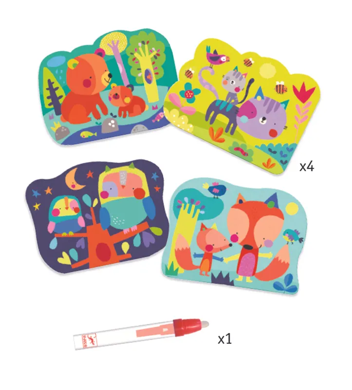 Härligt målarset till minstingen och inte behöver du oroa dig för att få färg överallt heller. Både motiv och penna kan återanvändas många gång. Fyll pennan med vatten och börja måla. Se hur fler och fler detaljer börjar visa sig på bilden, Superspännande för de minsta. Storlek: 21 x 26 cm