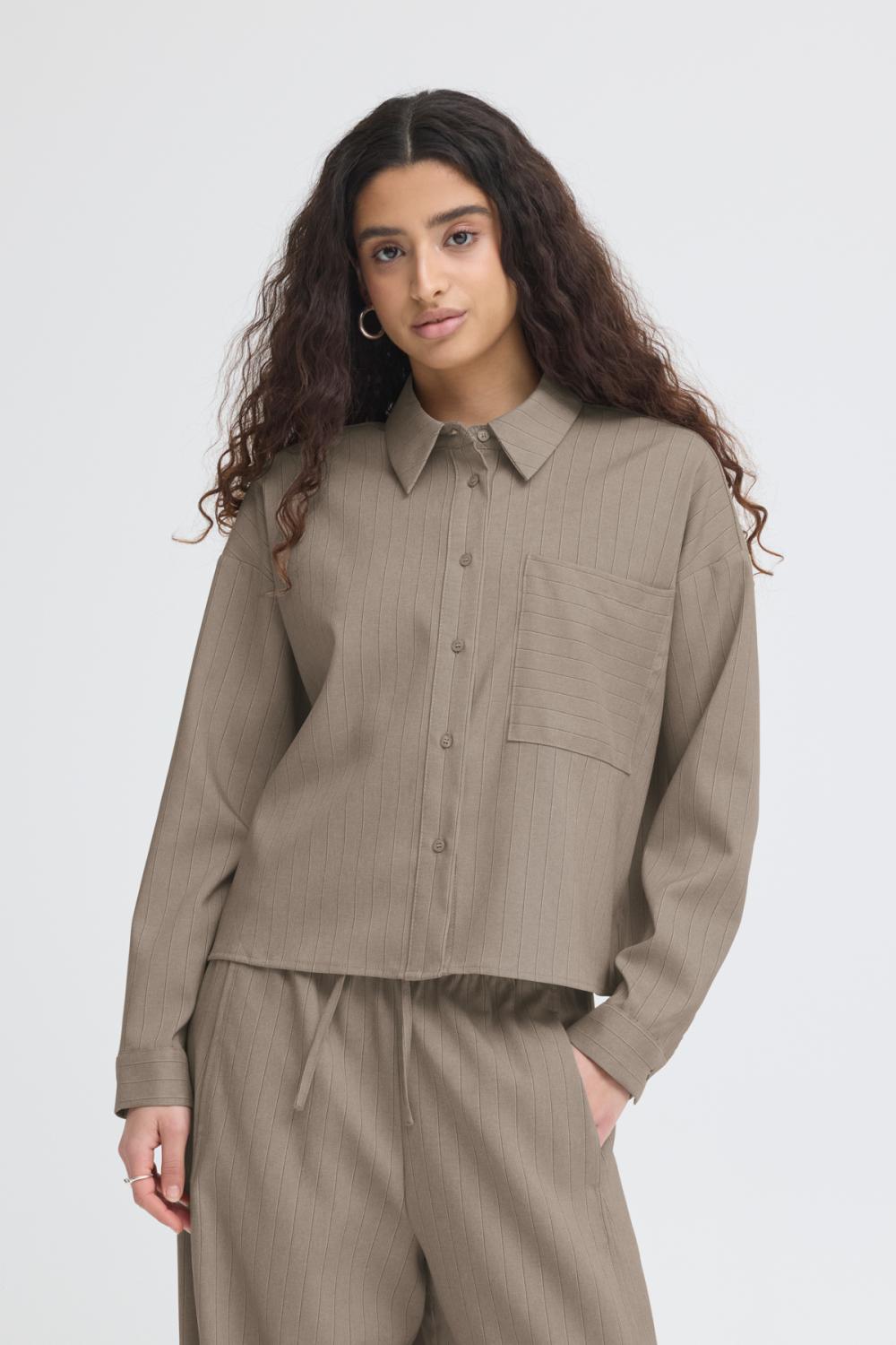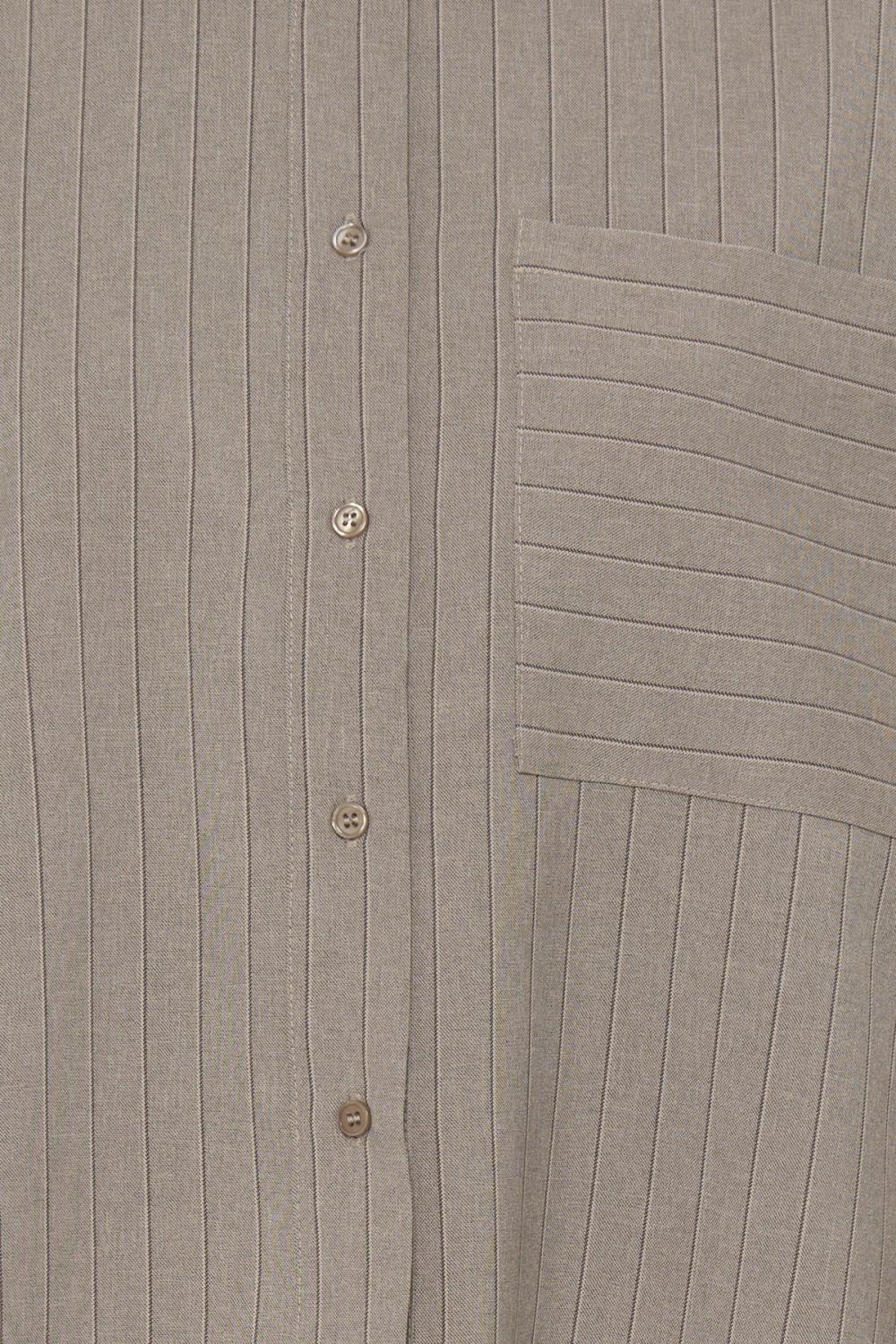 Randig skjorta med kort, boxig passform, spetsig krage och knappstängning. Bröstficka och långa ärmar ger ett stilrent, uppdaterat uttryck.