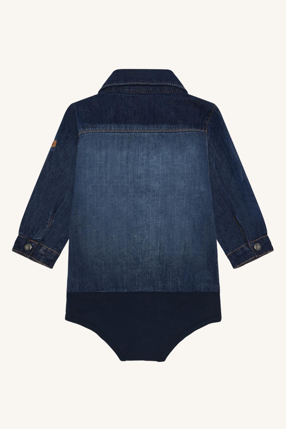 Cool skjortbody från Hust and Claire i mörkblå denim med mjuk bomull nedtill. Skjortbodyn har en fin krage och tryckknappar framtill. Den har långa ärmar och en fin bröstficka. Skjortbodyen stängs med tryckknappar mellan benen.