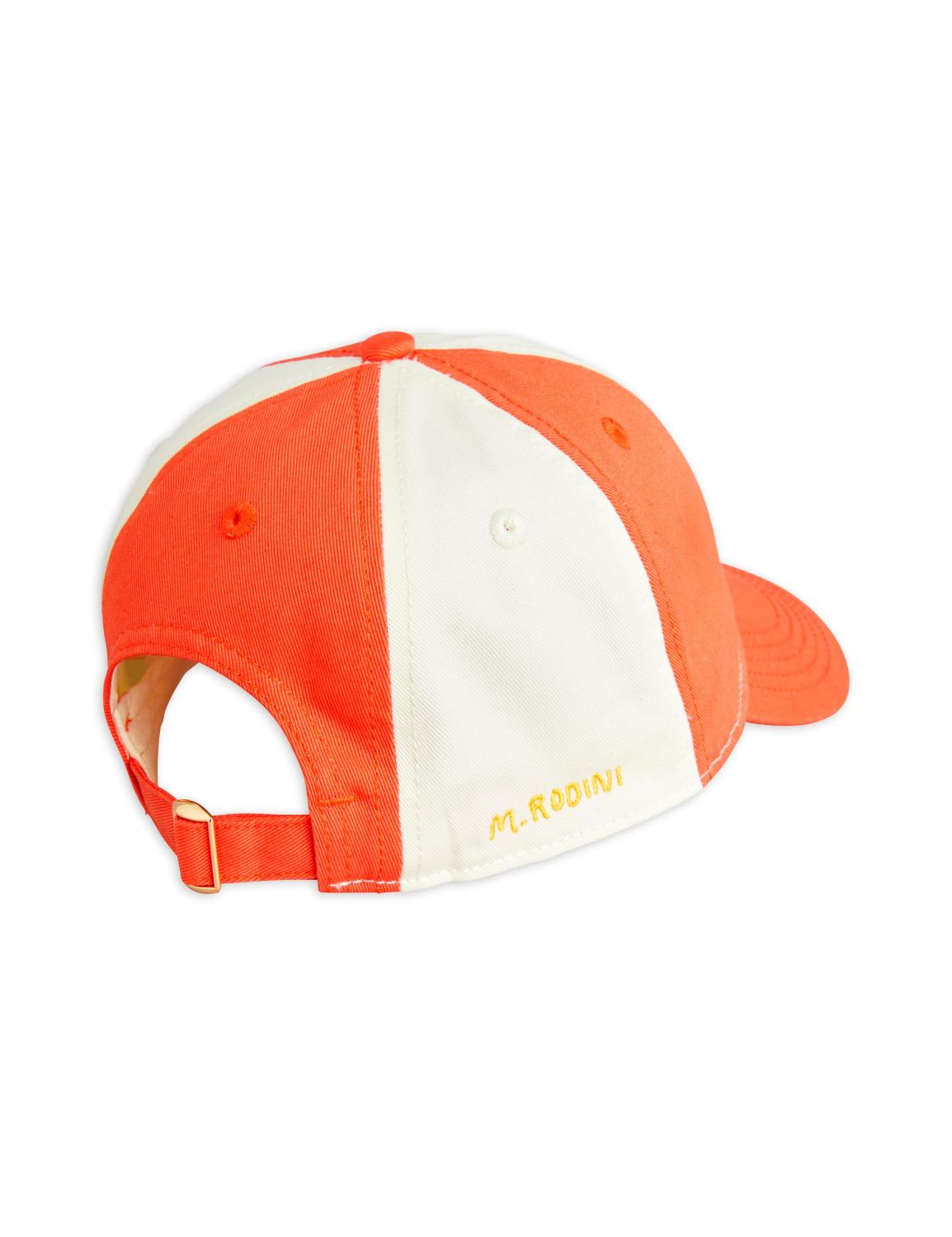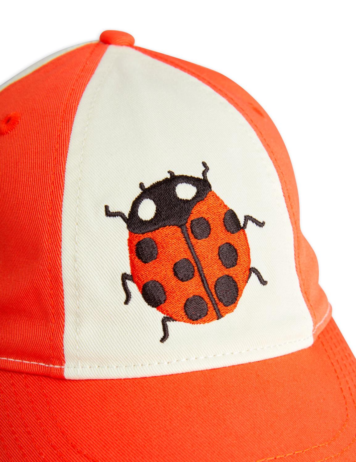 Röd och vit keps med broderad Ladybug-patch framtill, tillverkad i 100 % ekologisk bomull. Kepsen är justerbar med ett metallspänne baktill för bästa passform.