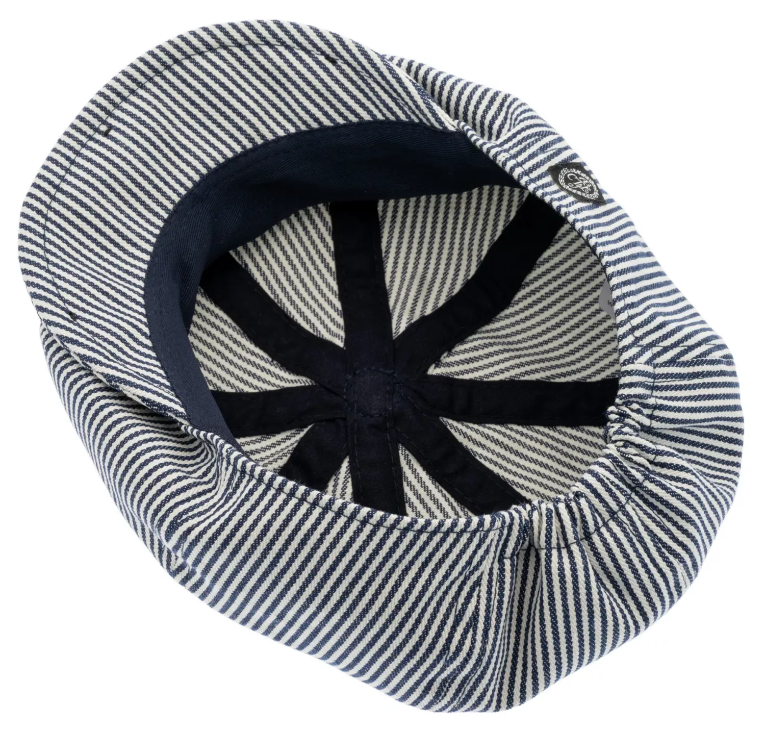 Newsboykeps för barn in ett tvåfärgat randigt bomullstyg i vitt och indigo för den rätta sommarkänslan.