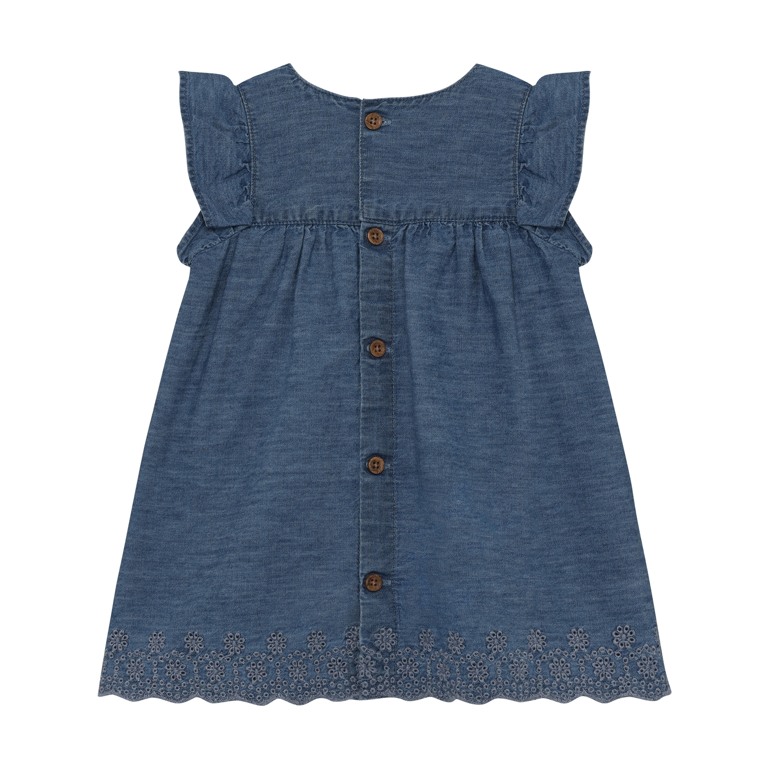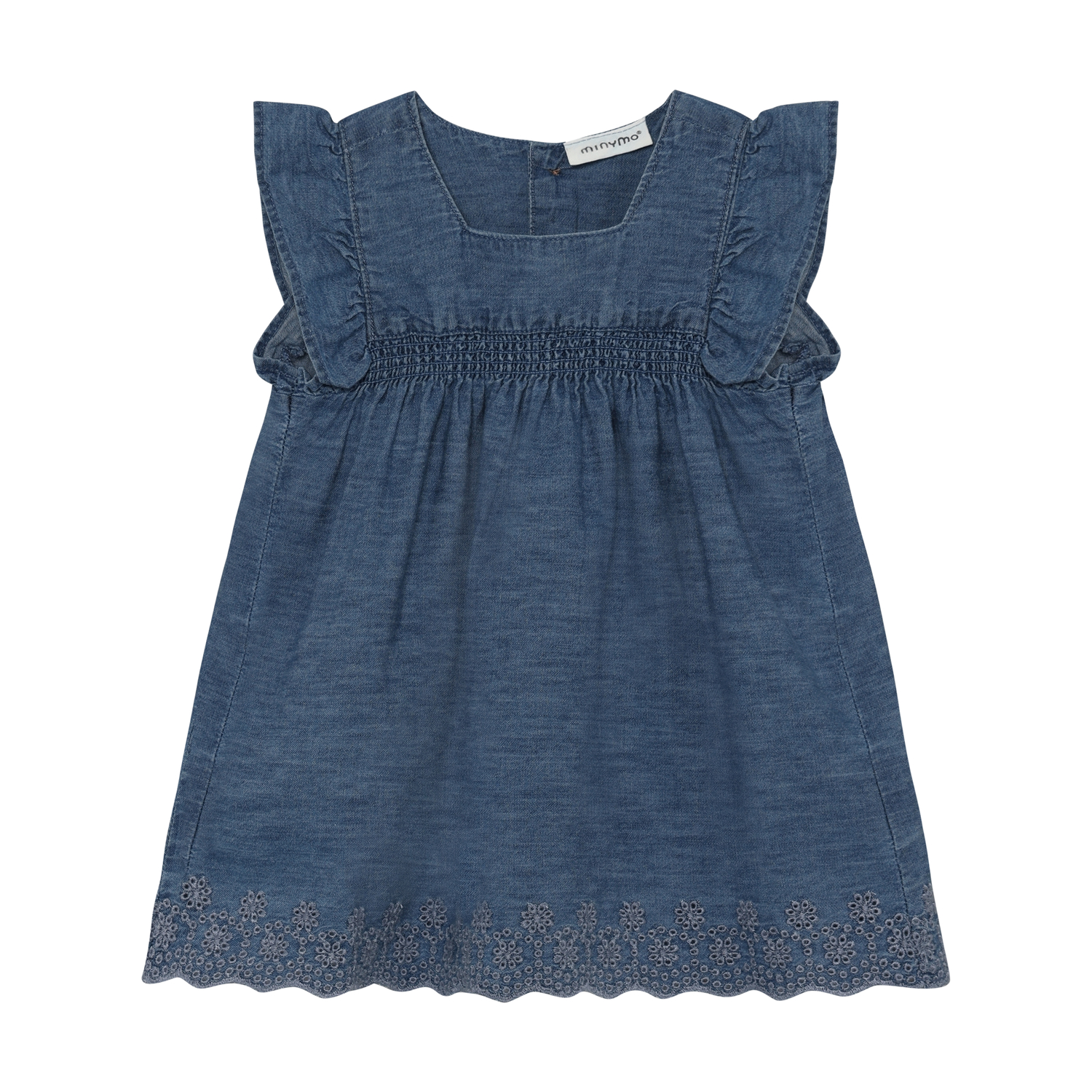 Sleeveless dress från Minymo. The dress has a denim look. It features ruffles on the shoulders, and the hem is wavy with patterns. Additionally, the dress has an elastic band above the chest and a square neckline. It closes at the back. The dress is made of 100% cotton.