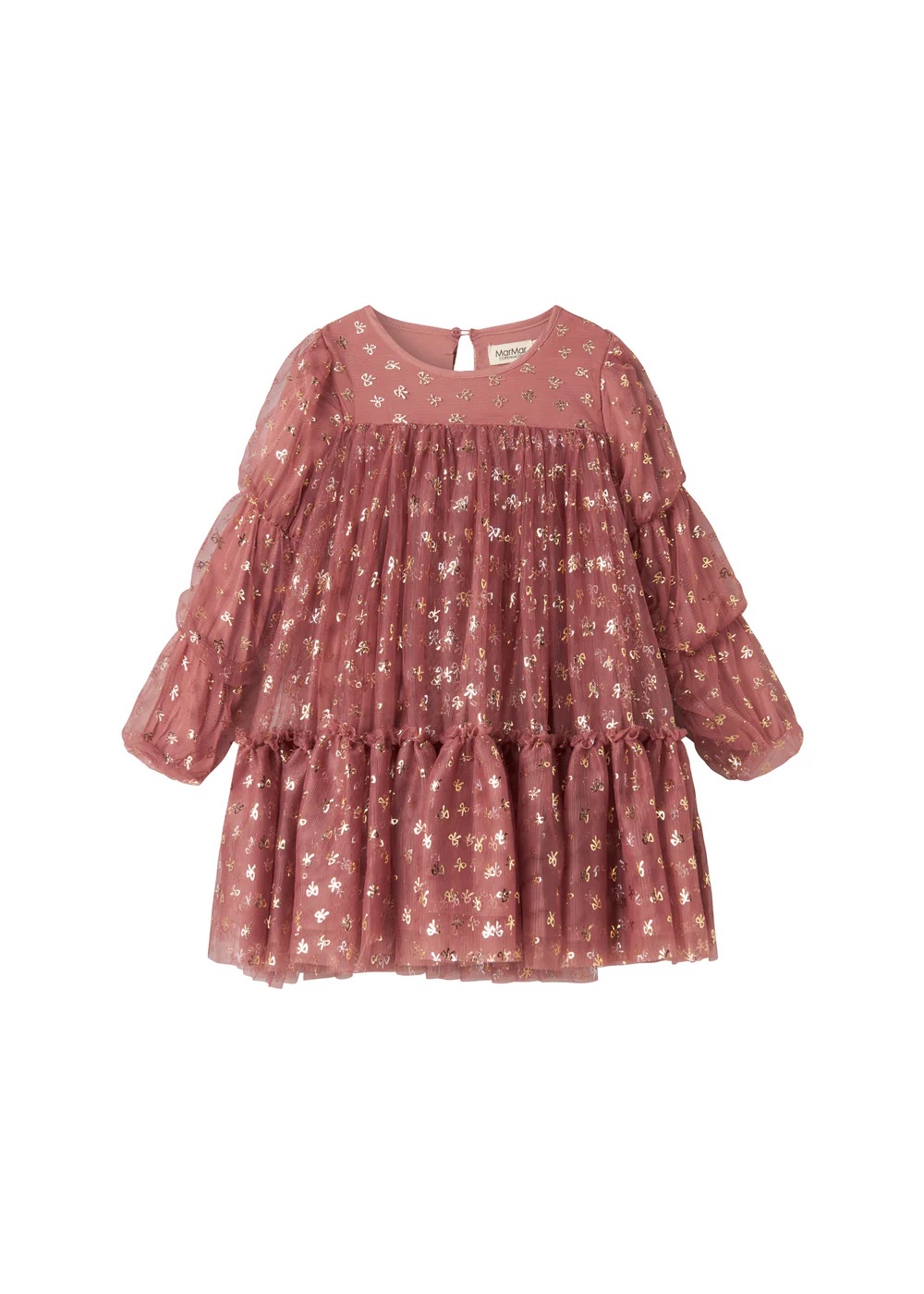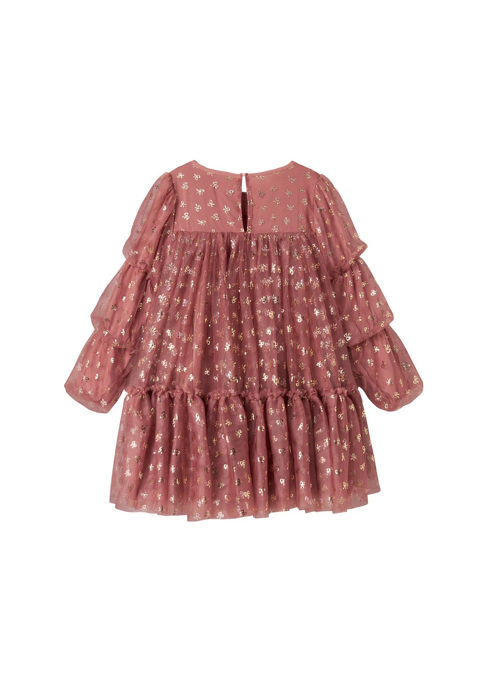 Långärmad tyllklänning med mycket volym och mjukt bomullsfoder. Klänningen är dekorerad med guldfärgade rosetter, har knappknäppning baktill och klänningens längd går ovanför knät.