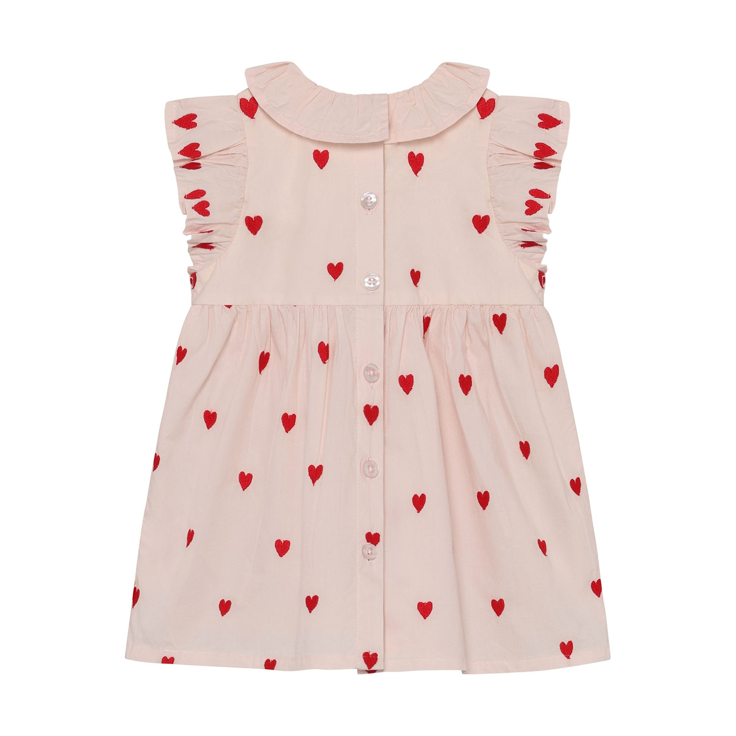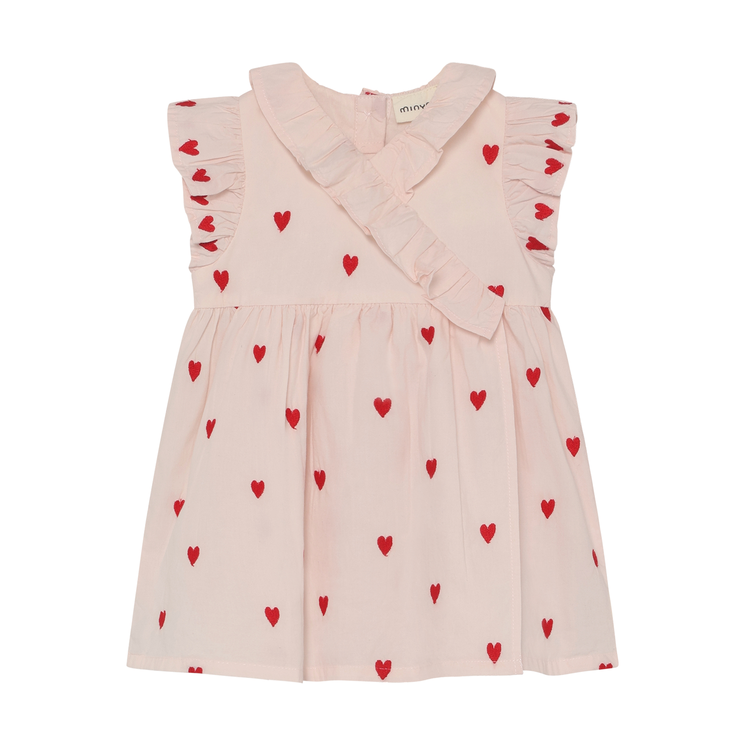 Bedårande Minymo klänning i en sart rosa nyans med ett sött heltäckande tryck av broderad röda hjärtan. Den har en söt krage samt en snedställd volangdetalj över bröstet. Ärmarna är korta och har även volanger. Klänningen är plisserad mellan topp och kjol och har även en tvådelad kjol med en slags omlott.