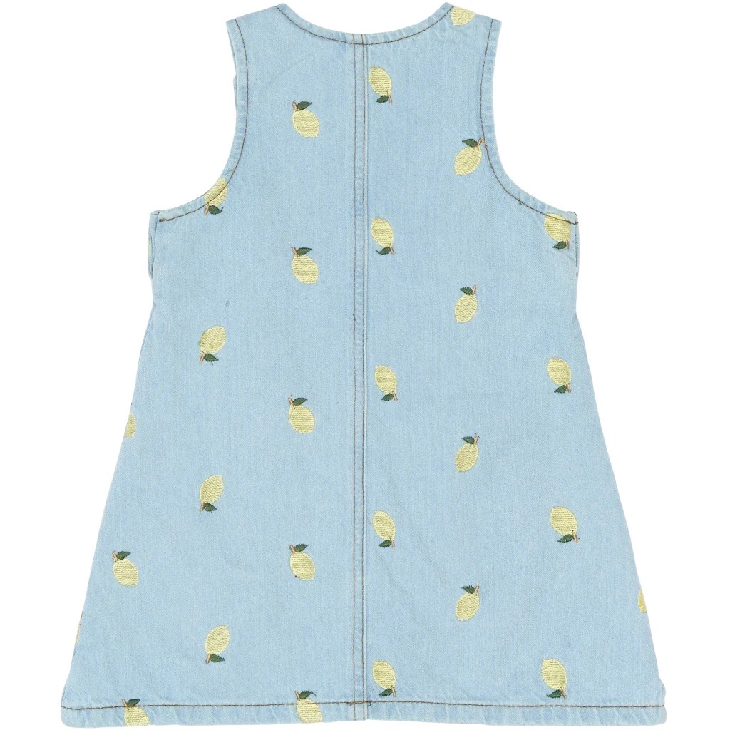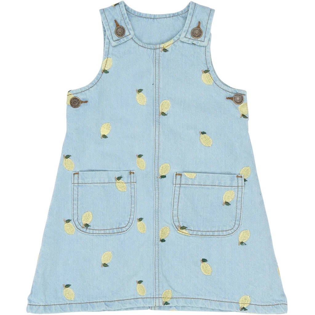 Denna söta jeansklänning för små flickor är tillverkad av mjuk 100 % bomull som känns bekväm mot huden hela dagen. Den ljusa tvätten är dekorerad med fina små citroner, vilket ger en fräsch och lekfull look. En lätt A-form säkerställer god rörelsefrihet, så det finns plats för både lek och äventyr. Praktiska axelknappar gör påklädningen enkel, och de två framfickorna är perfekta för små skatter. Bär den ensam på varma dagar eller över en T-shirt och med strumpbyxor när vädret är svalare.