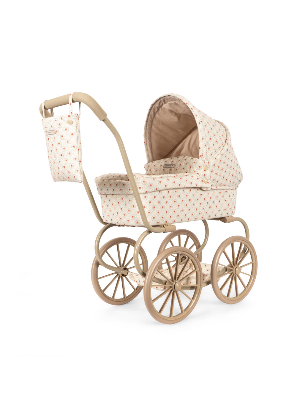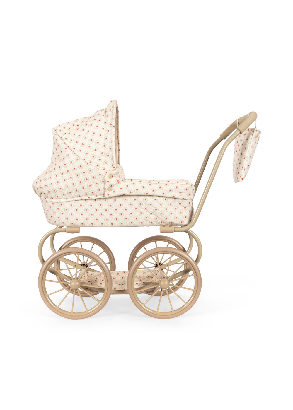 Dockvagn i vintagestil i en mindre modell som är lätt för små dockföräldrar att köra. Designad med fyra stora hjul som ger stabil och smidig körning, quiltat tyg och dekorativa vågade kanter. Dockvagnen har en fällbar sufflett och en vadderad förvaringskorg under liggdelen. Stommen är av metall med mjuka, skumvadderade handtag. Levereras färdigmonterad och är enkel att fälla ihop och förvara.