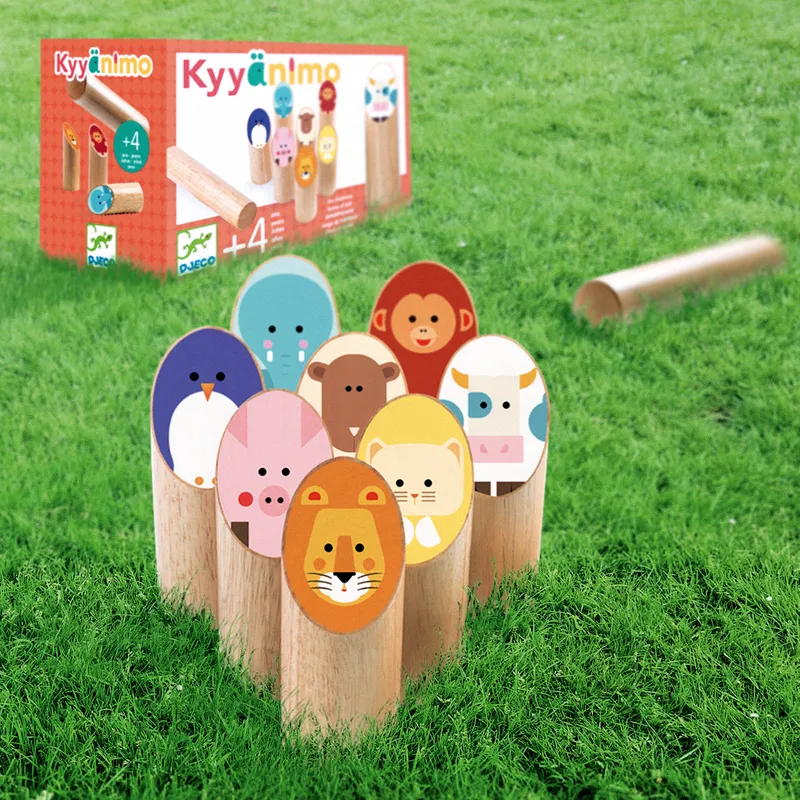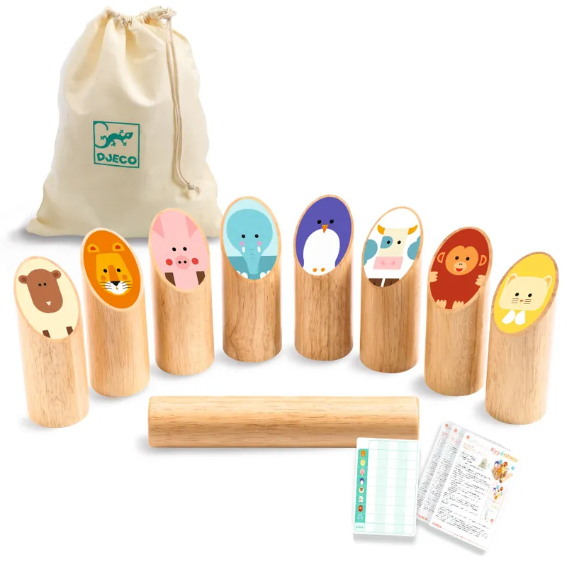 Från +4 år. Kul trädgårdsspel för de yngre spelarna, inspirerad av spelet Mölkky (nordisk trädgårds bowling). Trevligt spel tillverkat i trä, speciellt anpassat för små händer och yngre spelare, med förenklade regler. Ställ upp de fint målade "käglorna" med djuransikten på lagom avstånd och försök slå ner dem med kastpinnen. Medföljer gör en tygkasse att förvara och transportera spelet i. Innehåll: 8 käglor ca 13 cm höga, 1 kastpinne 20 cm - Ø 4 cm, en förvaringskasse, 10 poängprotokoll samt ett häfte med instruktioner och regler på flera språk inklusive svenska.