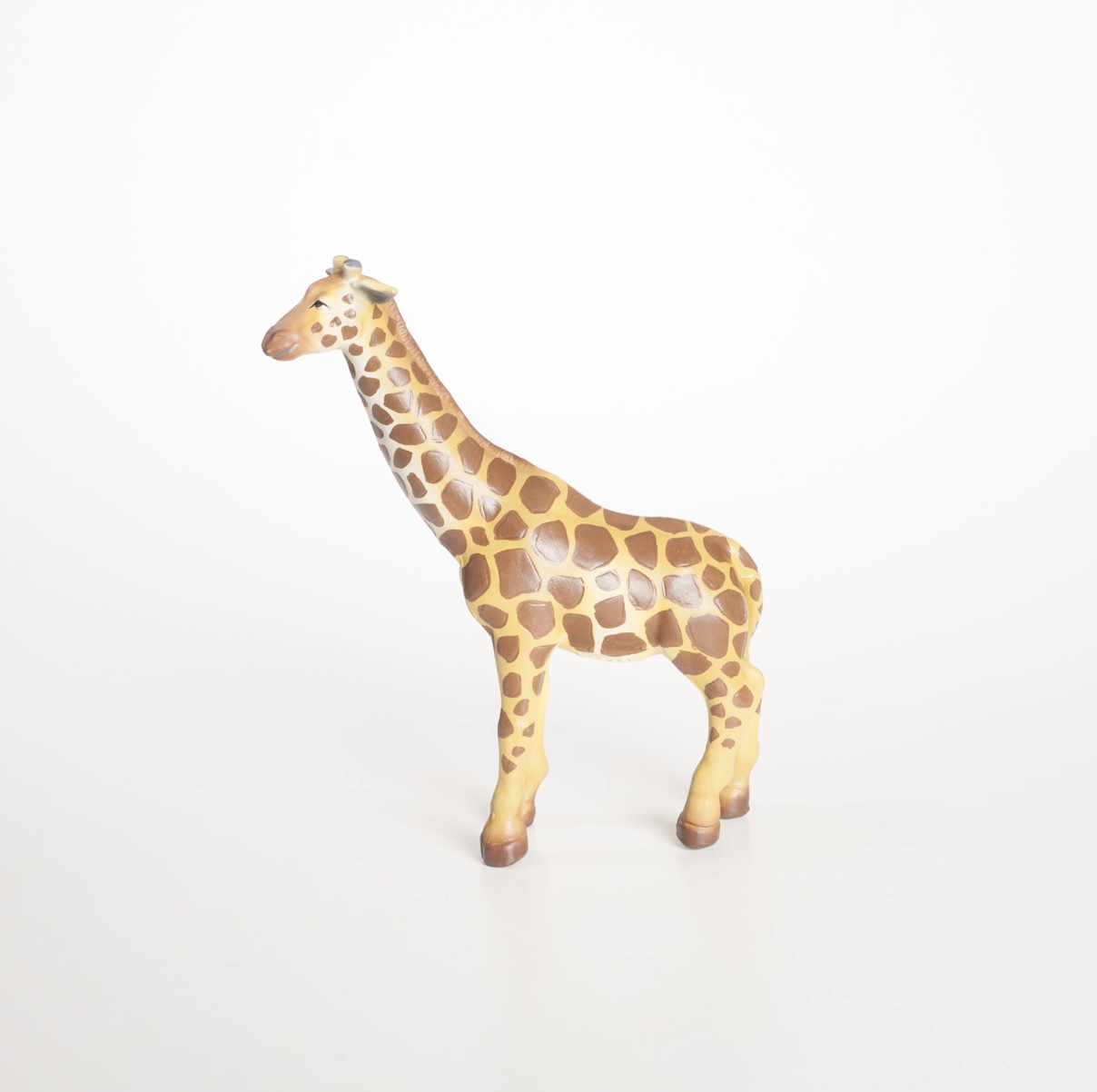 Giraff i naturgummi, stoppad med vadd. Perfekt som ersättning för plastdjur. Vadden ger tyngd i djuret samtidigt som det är smidigt och mjukt. Gör inte ont att trampa på och har inga vassa kanter.