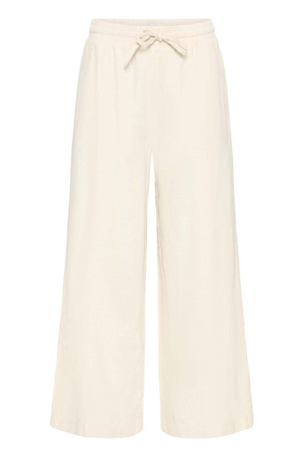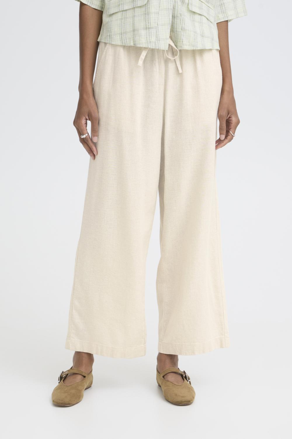 Byxor med breda ben och elastisk midja ger en ledig och bekväm passform. Justerbar dragsko och hel längd bidrar till användarvänlig design för olika tillfällen.