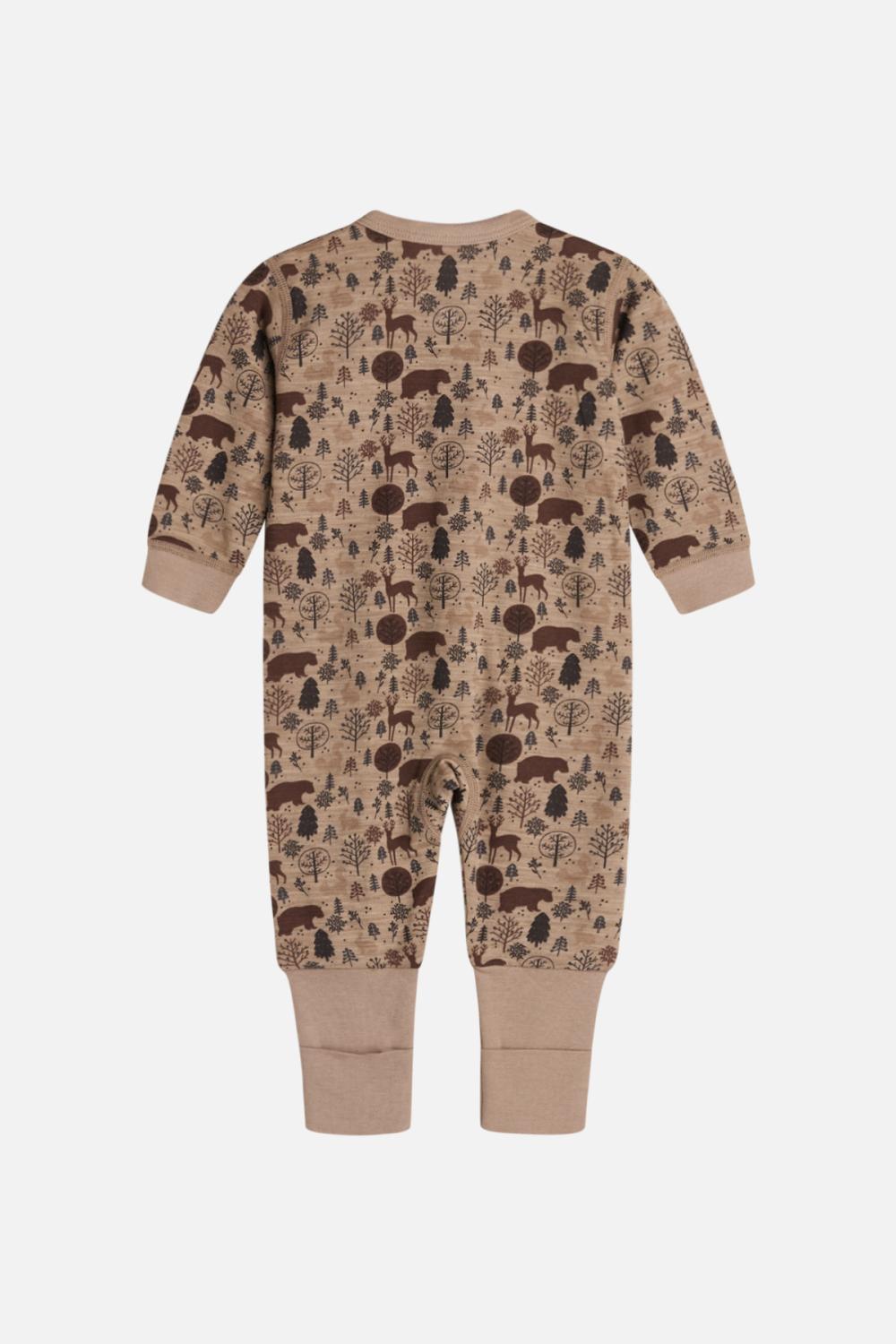 Långärmad heldress i bekväm, töjbar ull och Viskos av bambukvalitet med tryck av djur och träd. Overallen stängs med knappar fram med en omlott look ner över magen och på vänster fot. På fötterna fästs en lång bit som man kan sätta foten igenom men som även kan vikas ihop och användas som strumpa. Det finns en hopfällbar fot upp till storlek 86. Denna produkt är certifierad med Oeko-Tex 100®.