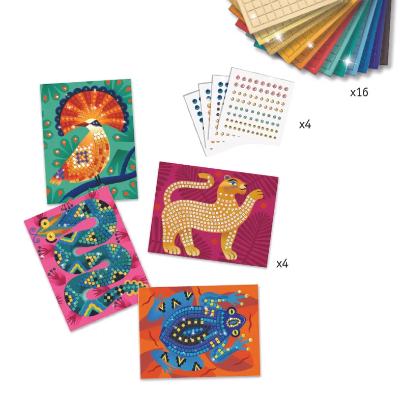 Spännande mosaikpyssel med stickers med metallglans och olika former. I förpackningen ingår det 4 olika motiv, 16 ark med fyrkantiga stickers och 4 med runda stickers. Temat i förpackningen är djungeldjur i fantastiska färger. Storlek: 19,5 x 26 cm