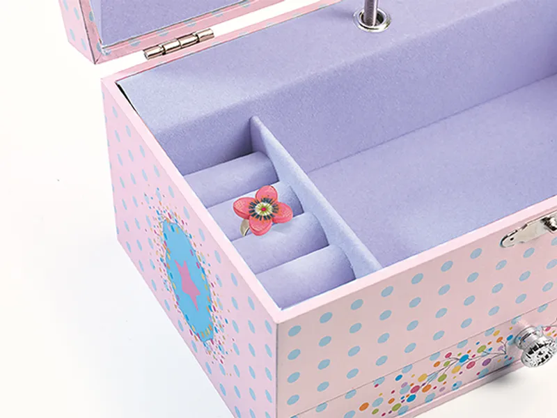 Fint kombinerat smyckeskrin och speldosa i mest lila och rosa färger. En söt ballerina i rosa kjol dansar för dig framför stjärn-formade speglar när du dragit upp mekanismen genom att snurra på nyckeln som sitter på baksidan av skrinet och sen öppnar locket. Melodin att lyssna till är "Invitation to the Dance" av Carl Maria Von Weber och låten kan spela i upp till 2,5 minuter. Under locket finns ett fack för större smycken samt ett fack med hållare för ringar, örhängen och andra små smycken, och i nederdelen av skrinet finns en utdragbar låda med en liten knopp som handtag.