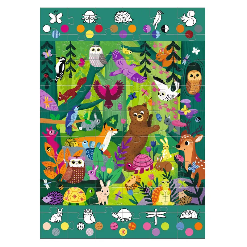 Från +5 år. Ett riktigt stort och färgglatt 54-bitars pussel med många av skogens vilda djur, men det är inte allt! När den första utmaningen med att sätta ihop pusslet är över så hittar barnet ett kul observations-spel där man ska hitta ett visst djur i tre speciella färger eller färgkombinationer. I pusslets övre och nedre kant finns svartvita teckningar av olika djur med tre cirklar under varje tillsammans visar dessa vilka exemplar av djuren som du ska hitta i den stora bilden - kan du hitta den blårandiga fjärilen, den ljusgröna sländan, den orange-rutiga sköldpaddan eller den lila igelkotten? För varje djur finns det tre olika färger och/eller mönster att leta reda på. Ett kul sätt att lära sig olika djur, öva på sin observationsförmåga och ha timmar av kul. Pusslet är av hög kvalitet som tål att läggas många gånger om och består av 54 stora bitar som tillsammans ett hela 50 x 70 cm stort motiv, så även de minsta djuren syns bra i den detaljerade bilden.