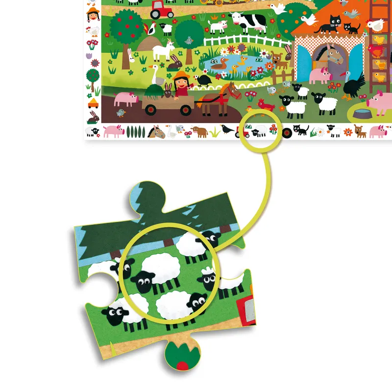 Ett kul och detaljrikt 35-bitars pussel med motiv från bondgården. Barnet kan upptäcka och lära sig om en mängd olika djur, naturtyper och saker som finns på landet. Det medföljer en affisch med pusslets motiv i naturlig storlek som kan användas som referens när pusslet läggs. Detta är både ett pussel och ett upptäckar-spel eftersom det runt pusslet finns det en ram med bilder på detaljer från huvudmotivet. Kan du hitta var alla dessa detaljer finns? Pusselbitarna är stora, enkla att hålla och tillverkade med hög kvalitet i Europa av FSC®️ MIX certifierad papp.