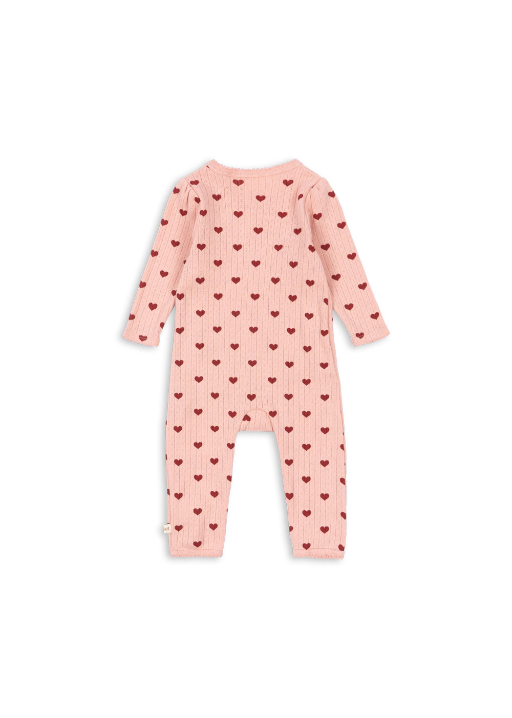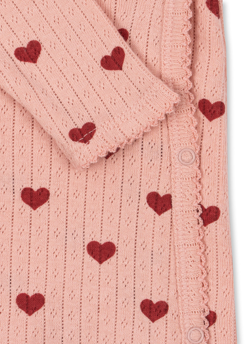 Mjuk onesie med en bekväm omslagsstängning för enkel påklädning. Har tryckknappar längs kroppen och benen samt dekorativt pointellemönster.