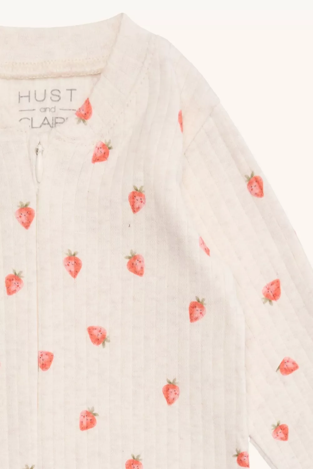 Långärmad overall i bred ribbkvalitet, tillverkad med traktortryck. Stängs med dragkedja framtill ner över magen och till vänster fot. Dräktens ärmar och ben är fållade.