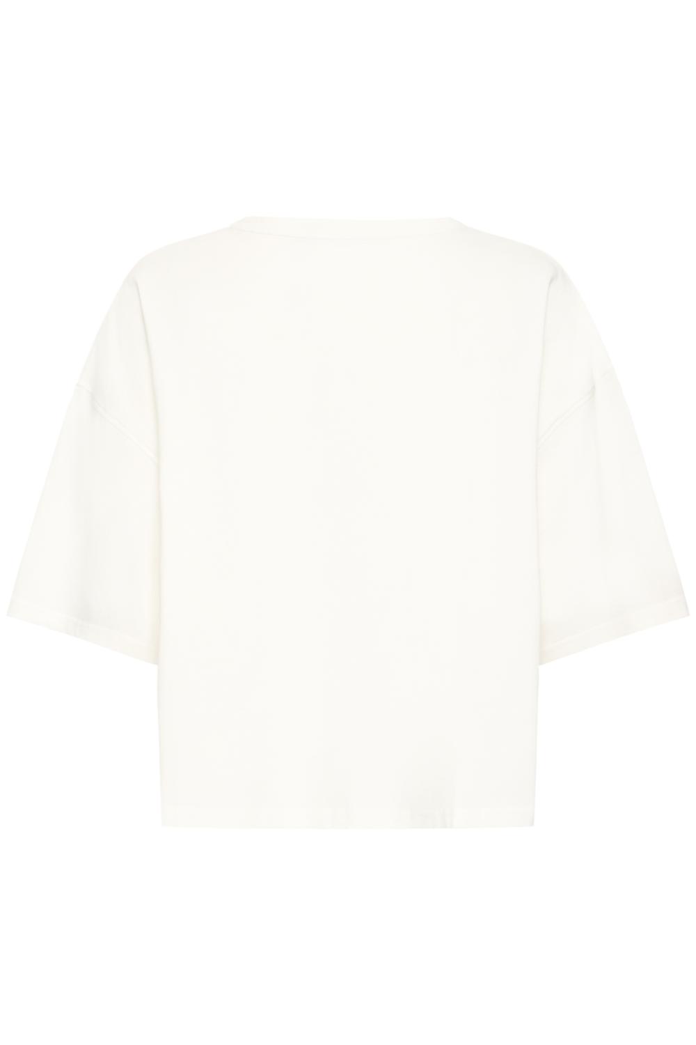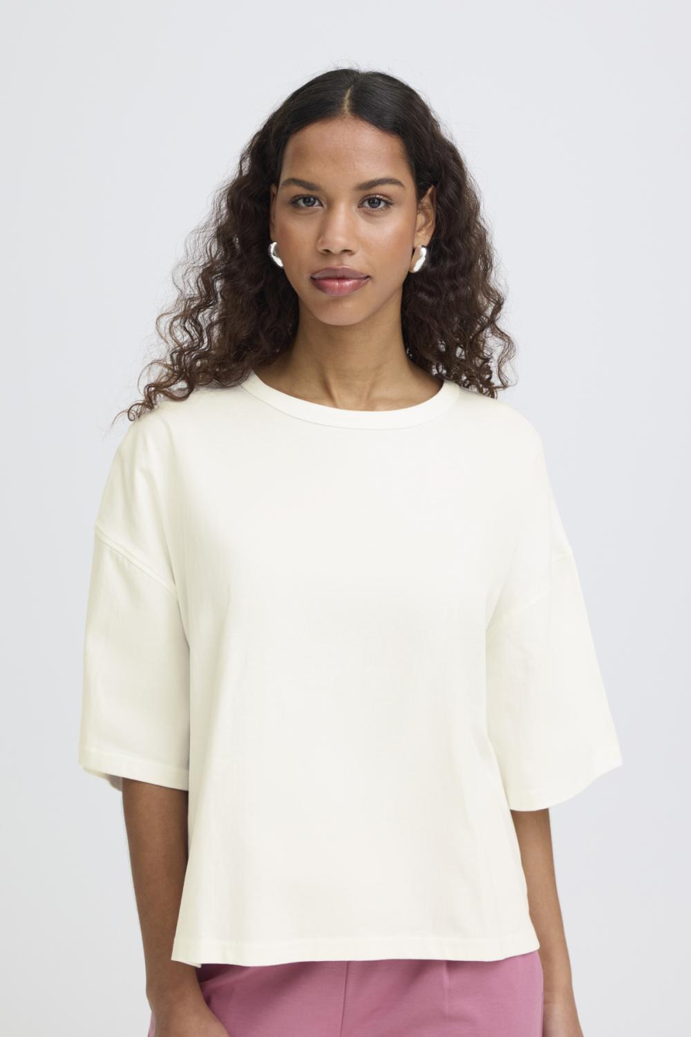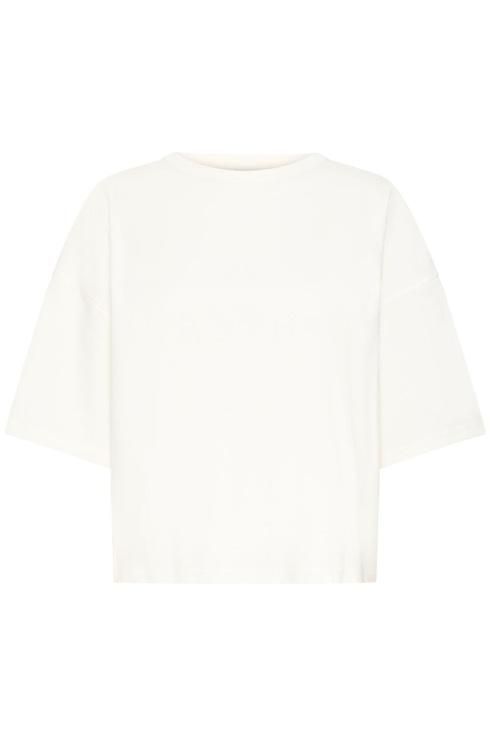 Boxig T-shirt i minimalistisk rak modell med sänkt axel och rund halsringning. Har ärmar till armbågen och slät finish för modern känsla.