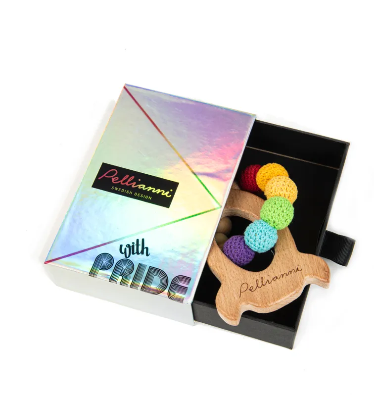 Skallra/bitring tillverkad av ekologiskt obehandlat björk och lönnträ.