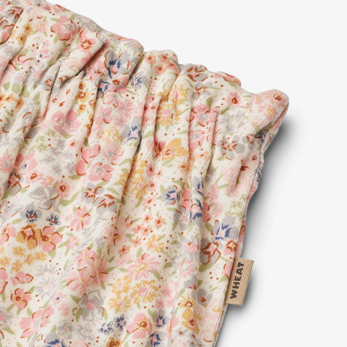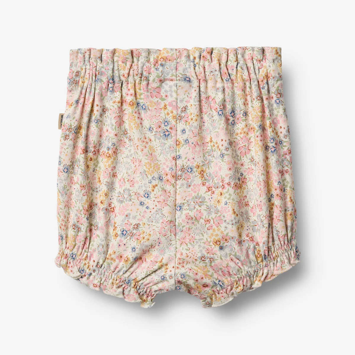 Söta shorts med tryck i mjuk ekologisk bomull för bebis. Fint blomstertryck i pastell.