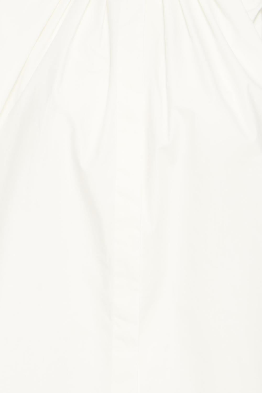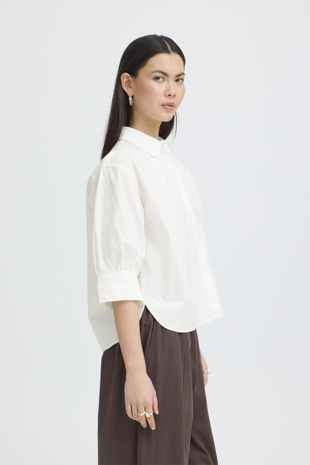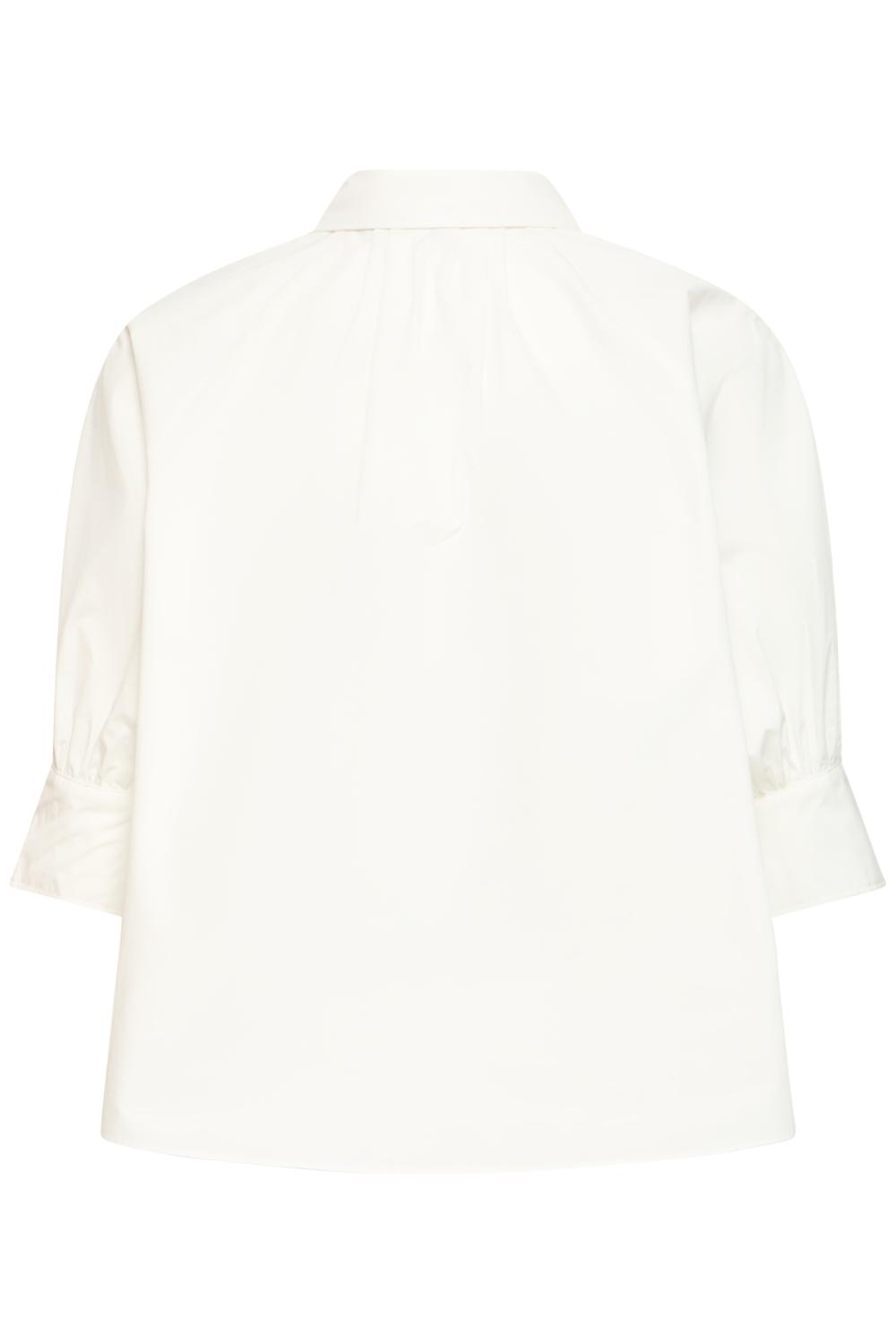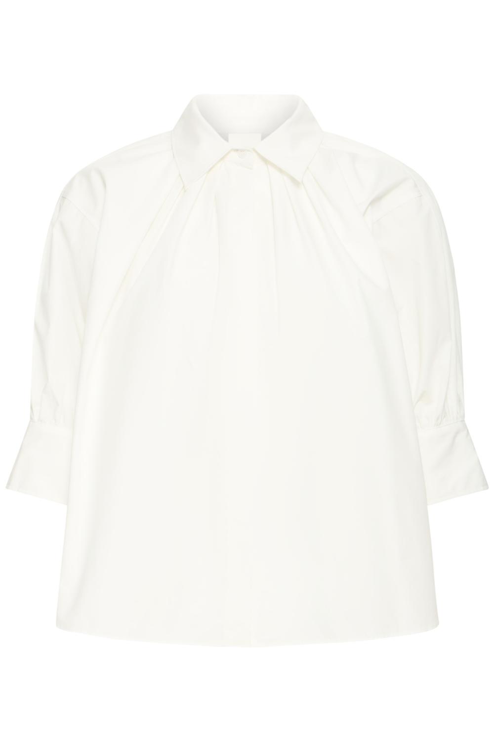 En oversize blus med markerad krage, mjuka veck framtill och breda 3/4-ärmar med distinkta manschetter ger en cool och modern silhuett.