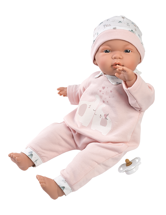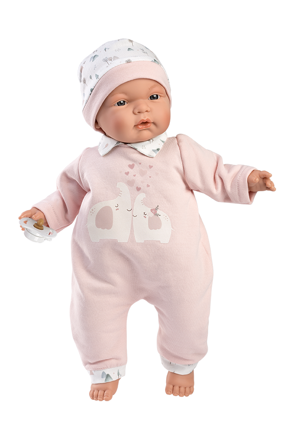 Siri är en mjuk docka utan ljud. Han är klädd i en rosa sparkdräkt med tryck på magen och mönstrad mössa.