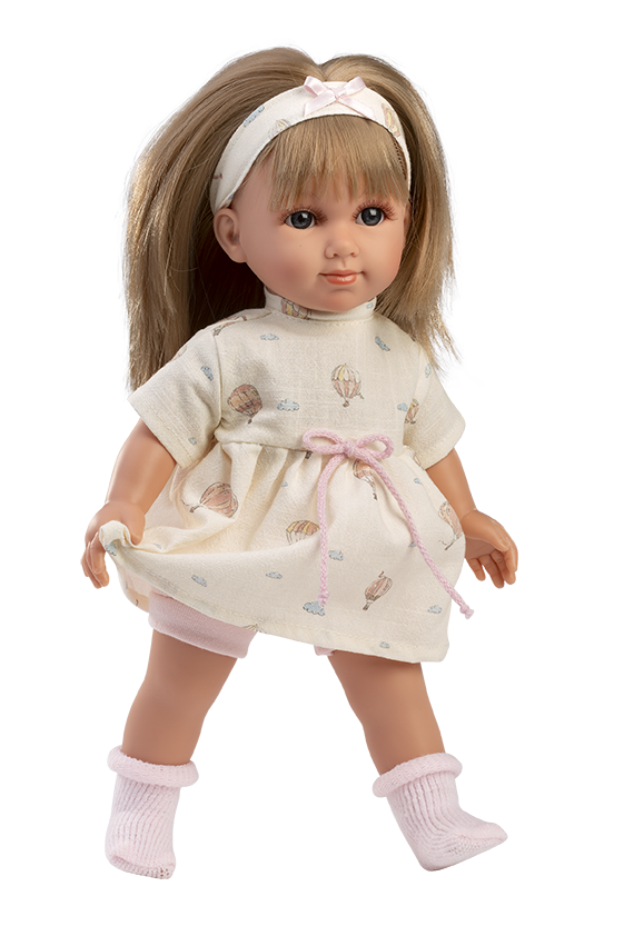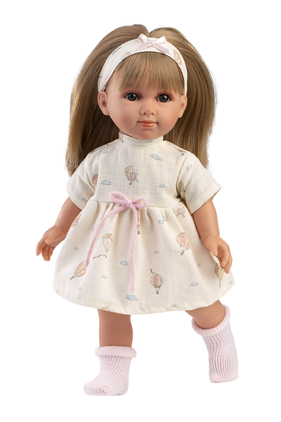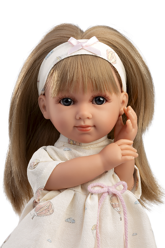 Färg: Ljus hy, rågblont hår, klänning med luftballonger och moln, hårband samt strumpor