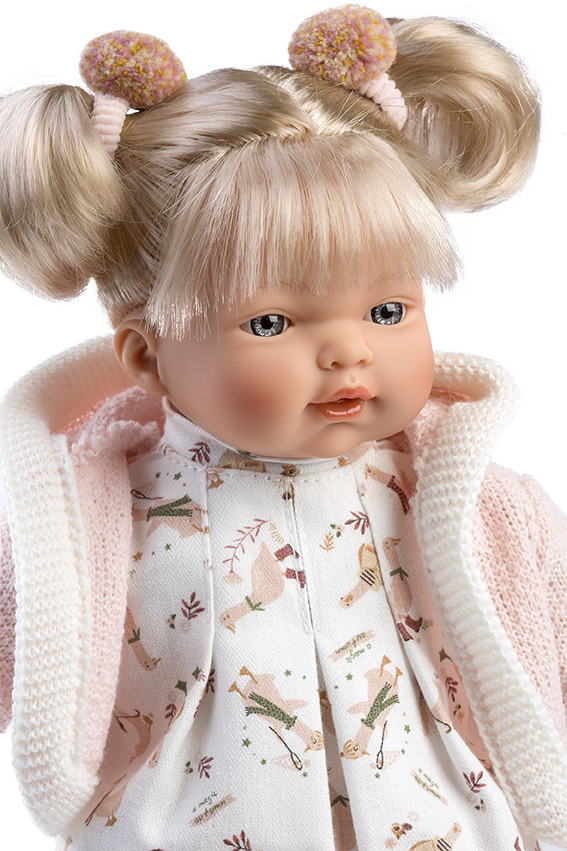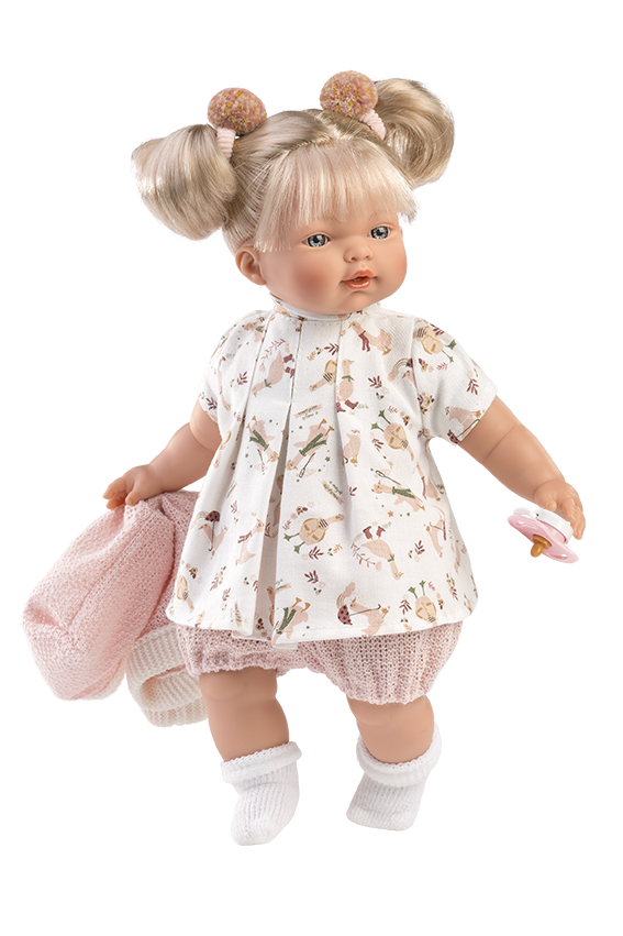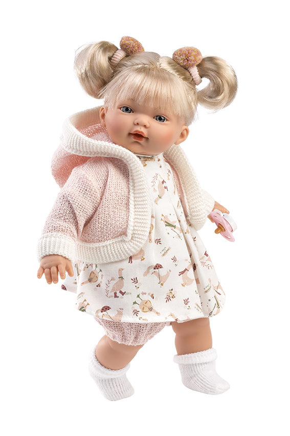 Nova är klädd i vit klänning med fåglar på och rosa/vit stickad kofta, korta byxor och sockar. Håret är uppsatt i två tofsar med rosett. Napp med hållare medföljer.