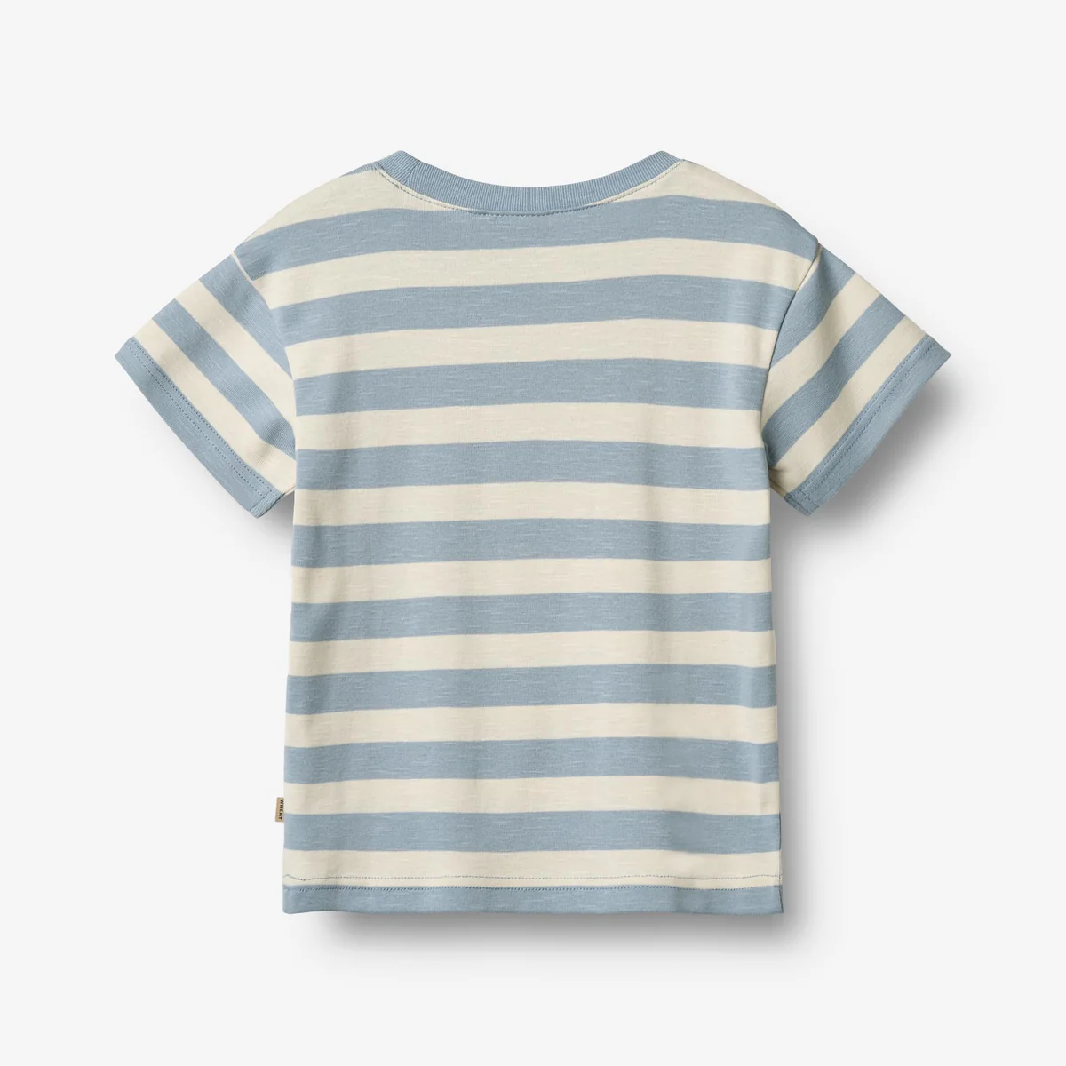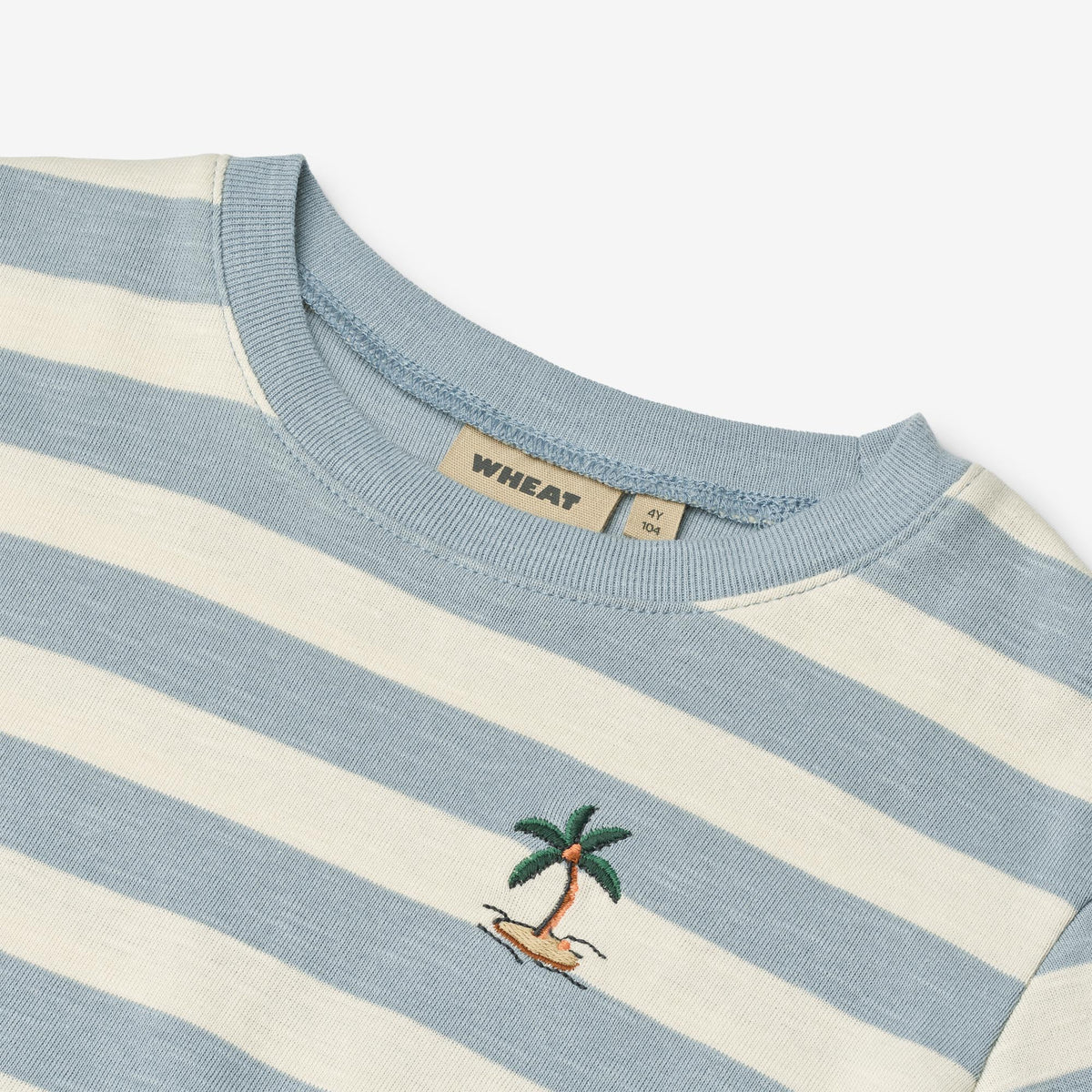 Klassisk kortärmad T-shirt med ränder i mjuk ekologisk bomull. T-shirten har ett broderad palmtryck framtill, vilket ger en rolig detalj.