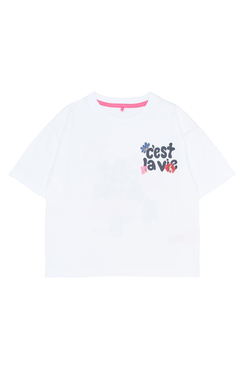 Denna kortärmade T-shirt för tjejer är tillverkad av 100 % ekologisk bomull. Modellen har rund hals och en lös, boxig passform med rörelseutrymme. Framtill finns ett litet brösttryck med texten "c’est la vie" och små blommor. Den enkla silhuetten gör den enkel att kombinera med shorts, jeans eller kjolar. Den kan bäras ensam på varma dagar eller som ett extra lager under en kofta eller jacka.