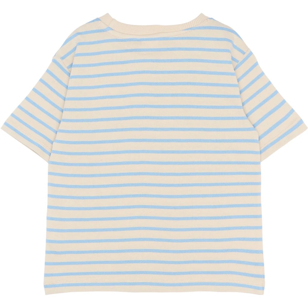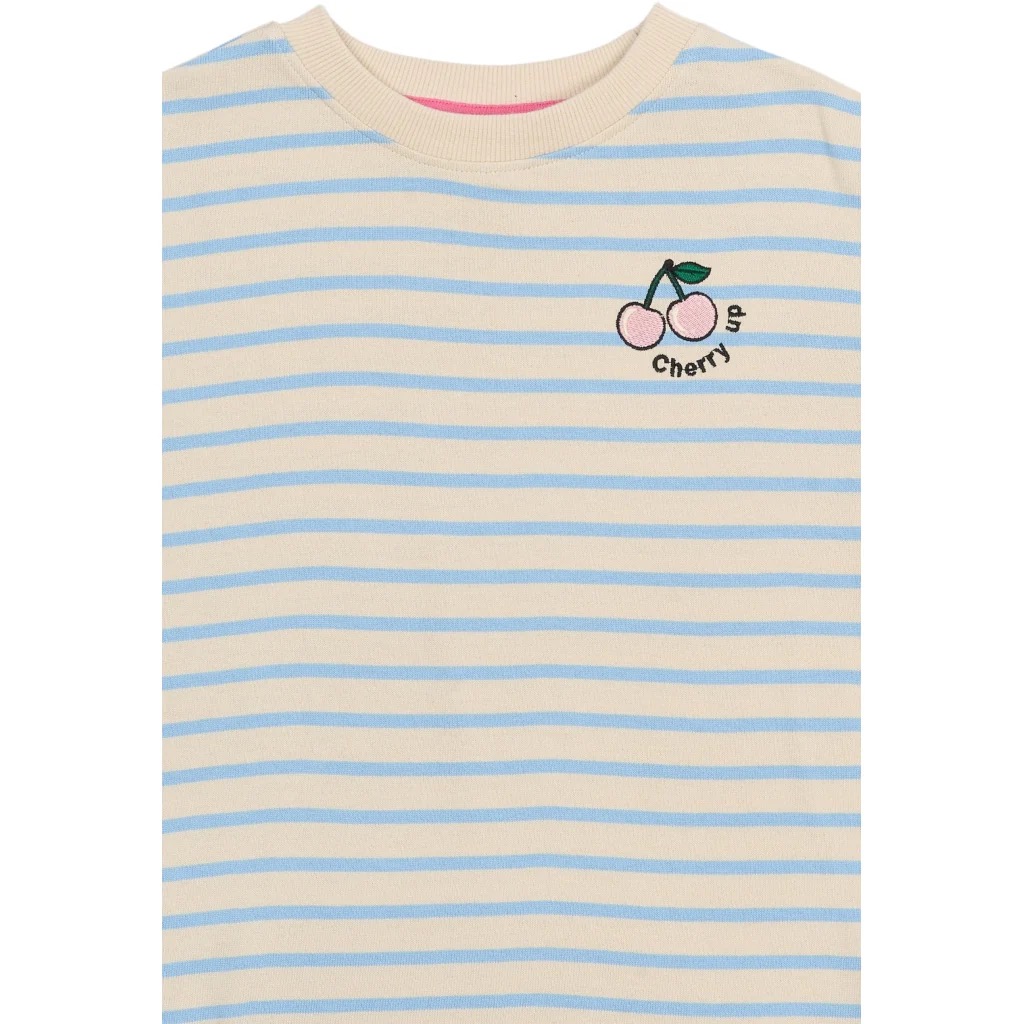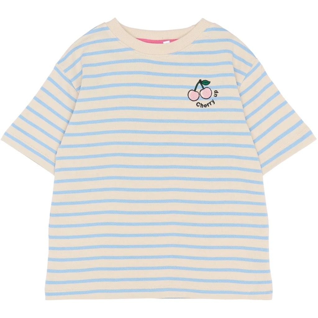 Denna t-shirt för flickor är tillverkad av 100 % ekologisk bomull. Den har korta ärmar, en ribbad rund halsringning och en rak passform som är enkel att matcha med andra plagg. Ytan är randig och det finns en liten broderi på bröstet för en enkel detalj. Bär den ensam på varma dagar eller som ett lager under en kofta eller jacka. Den är lätt att styla med shorts, byxor eller kjolar för vardagsbruk.