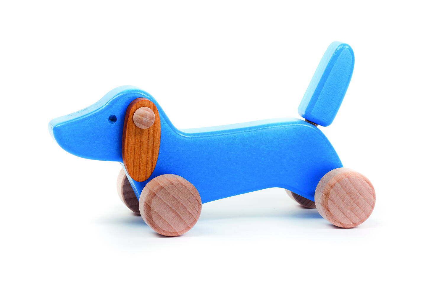 Hund på hjul som är kul att köra omkring med. Gedigen och genomtänkt träleksak av mycket hög kvalitet.