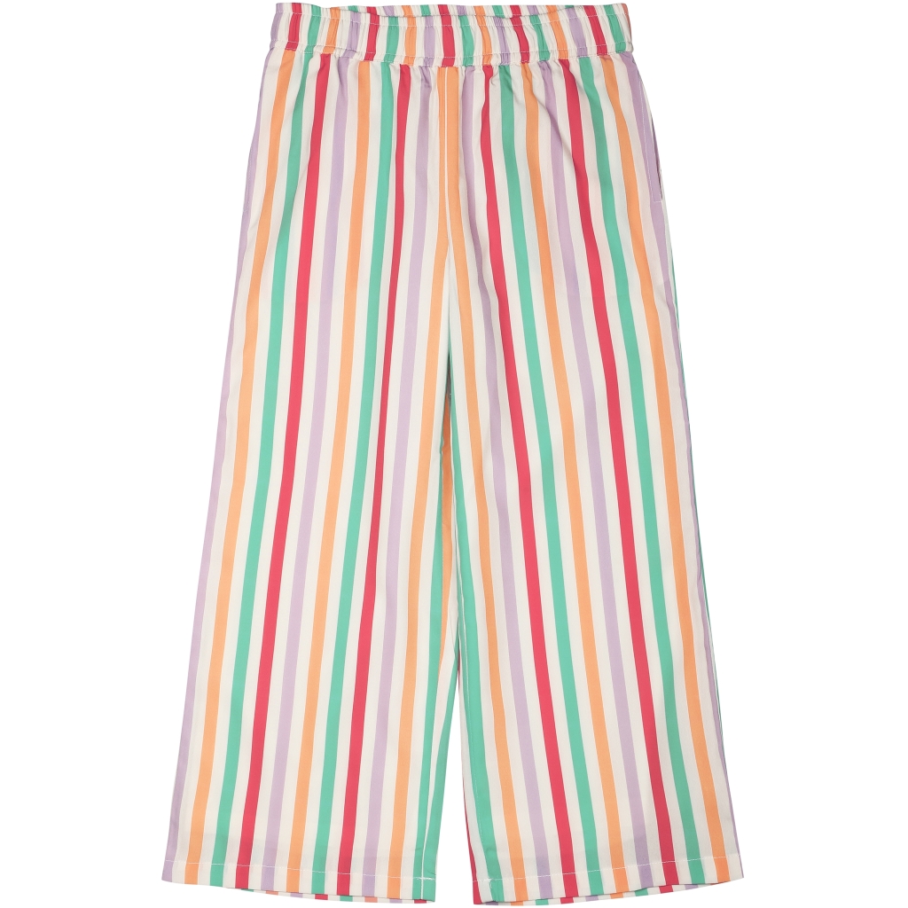Randiga byxor med vida ben och vertikala ränder i livfulla vårfärger. Dessa luftiga byxor med extra vidd i benen är underbart sköna och oemotståndliga med sitt godisliknande utseende. Dessa byxor är konstruerade med två lager och har ett mjukt och andningsbart innerlager av bomull och ett ytterskikt av silkeslen polyester. Det är mjuka, lätta byxor som är lätta att ta sig in i. Byxorna är perfekta att klä upp med en snygg topp och skor, eller så kan de kläs ner med ett par sneakers och en ledig topp.