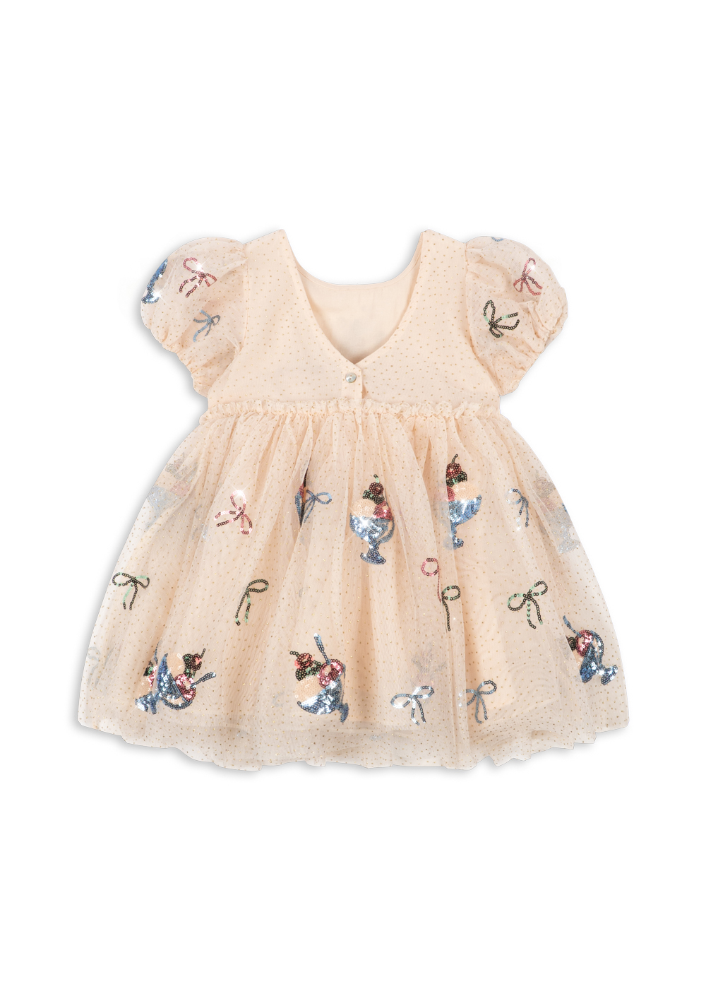 Denna voluminösa tyllklänning från Konges Sløjd har korta puffärmar och lekfulla paljettdekorerade glassmotiv som ger extra glans till festliga tillfällen. Det lätta tylltyget i polyester skapar en fyllig, snurrvänlig kjol, medan ett foder i 100 % bomull ger mjuk och luftig komfort mot huden. Den smickrande överdelen och den rynkade midjan ger god rörelsefrihet för kalas, uppträdanden eller fantasifull lek, vilket gör modellen till en mångsidig festklänning eller tutu‑inspirerad klänning. Denna premiumdesign matchas enkelt med strumpbyxor eller en mjuk kofta under svalare dagar och erbjuder ett stilrent, lekfullt uttryck som både barn och föräldrar uppskattar.